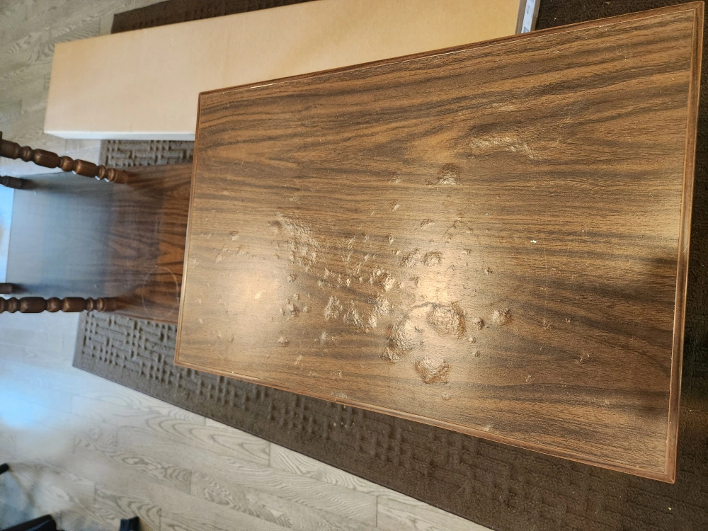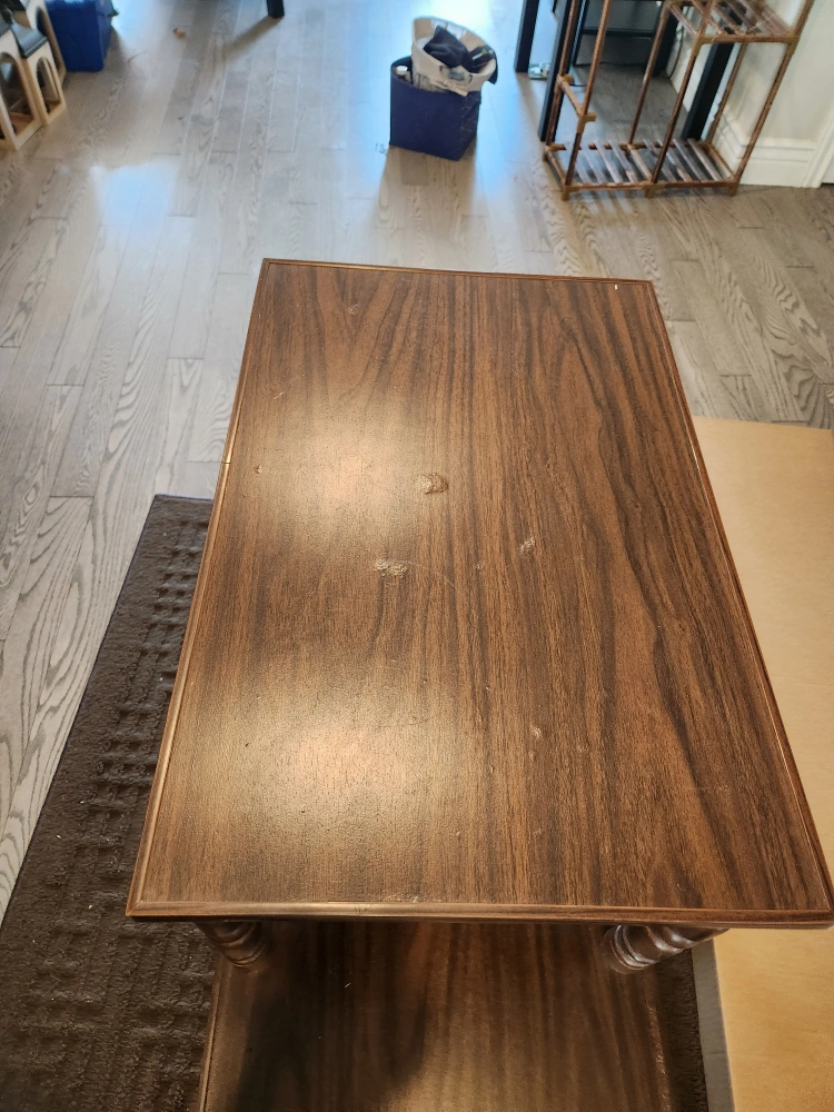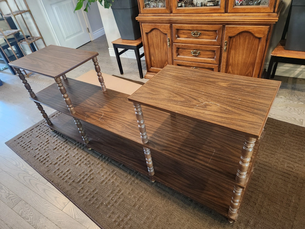 Selling a brown wooden 3-tier shelving unit. It's perfect for adding some storage and style to your home. It shows signs of use. Has water marks- is heavy so 2 people and a truck to take.