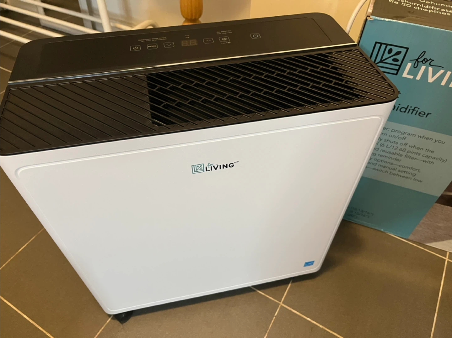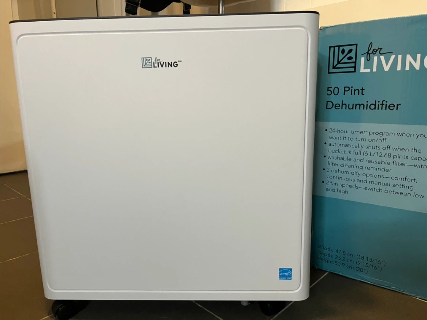 "For Living" 50 Pint White Portable Dehumidifier. Perfect for up to 3000-4000 square feet. Powerful and collects humidity quickly. Purchased at Canadian Tire in June and used twice, a total of 4-5 hours.