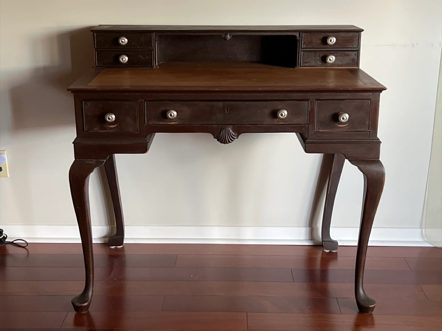 Giving away a lovely antique secretary desk. It features a beautiful dark wood finish with silver knobs. It has several drawers for storage and a unique design that would look great in any home.