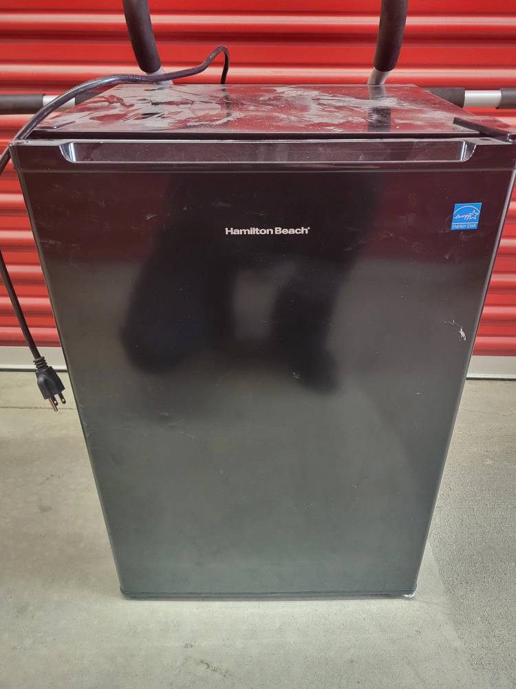 Selling a Hamilton Beach mini fridge in black. It's perfect for a dorm room, office, or small apartment. There are some signs of use, but it's still in good working condition!