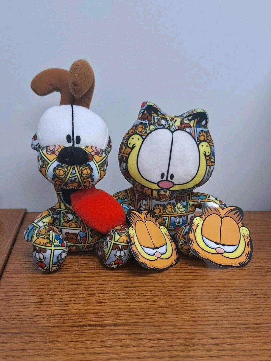 Selling a cute Garfield and Odie plush set! Both are covered in a fun comic book style pattern featuring Garfield characters. Perfect for any Garfield fan!
