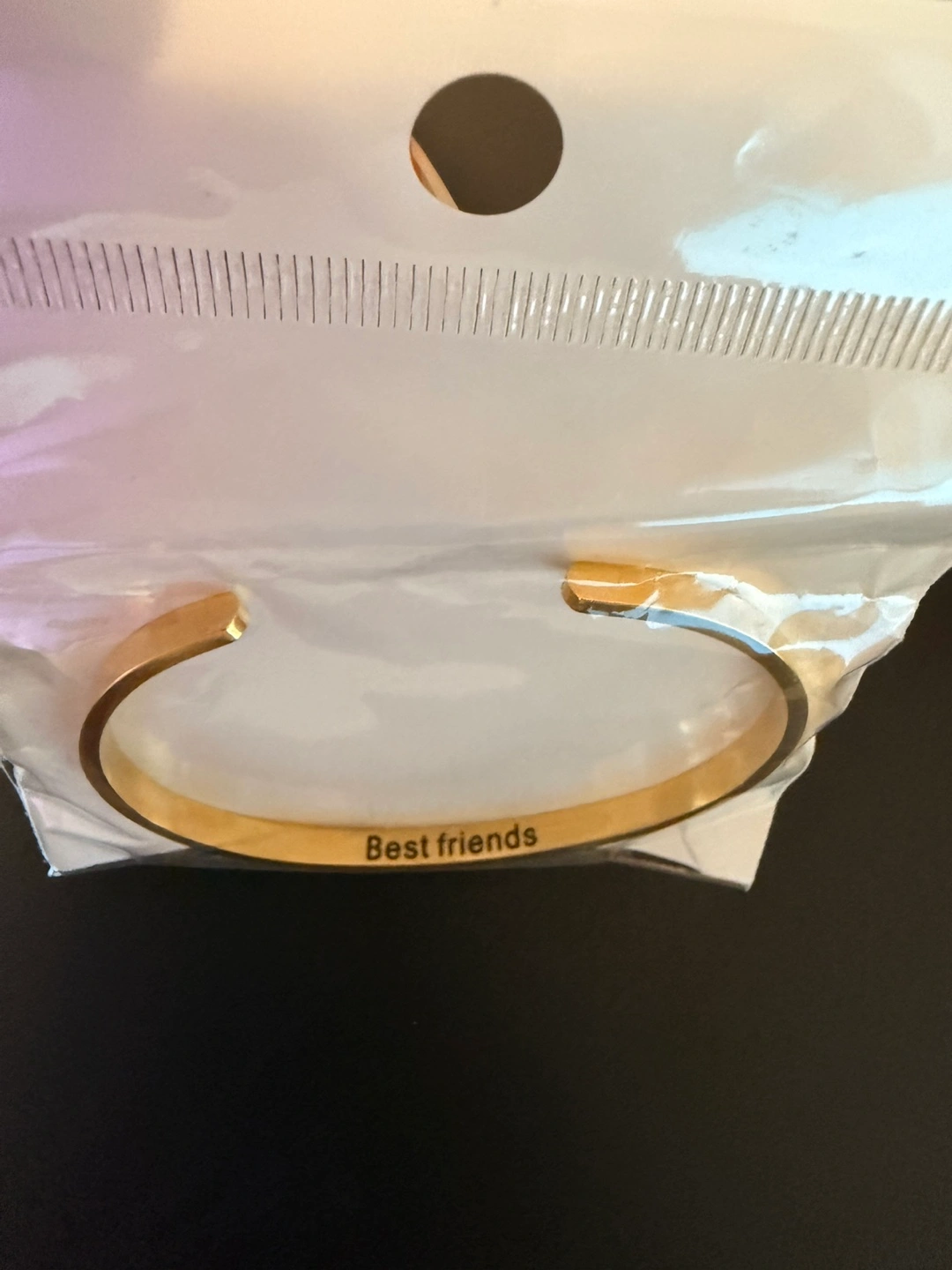 Selling a brand new gold-toned bangle bracelet that says 'Best friends' on the inside. It's still in its original packaging, so it would make a lovely gift for your bestie!