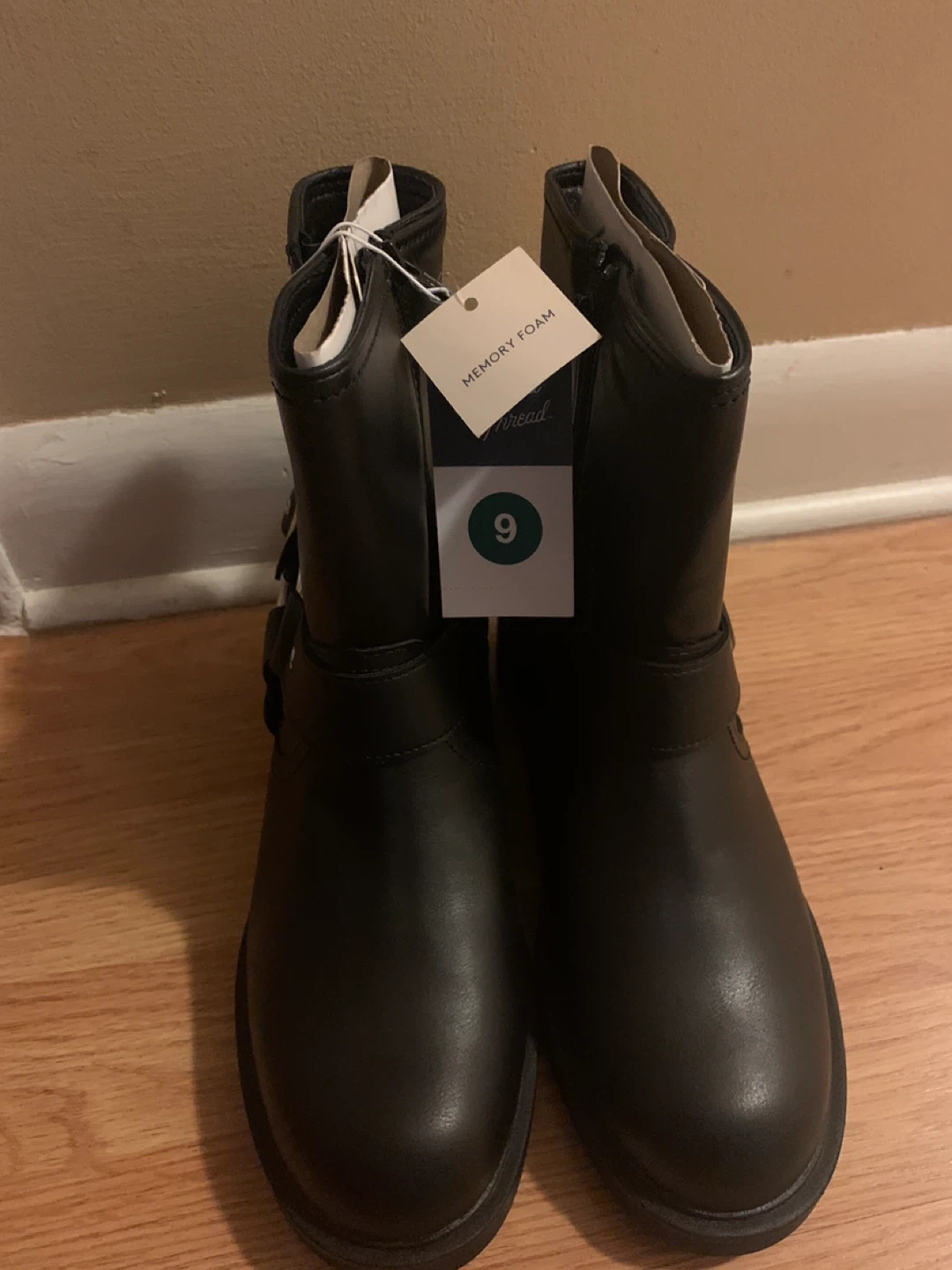 These are a new pair of Thread & Supply black boots in size 9! They have a memory foam insole for extra comfort. The boots feature a stylish buckle design.
