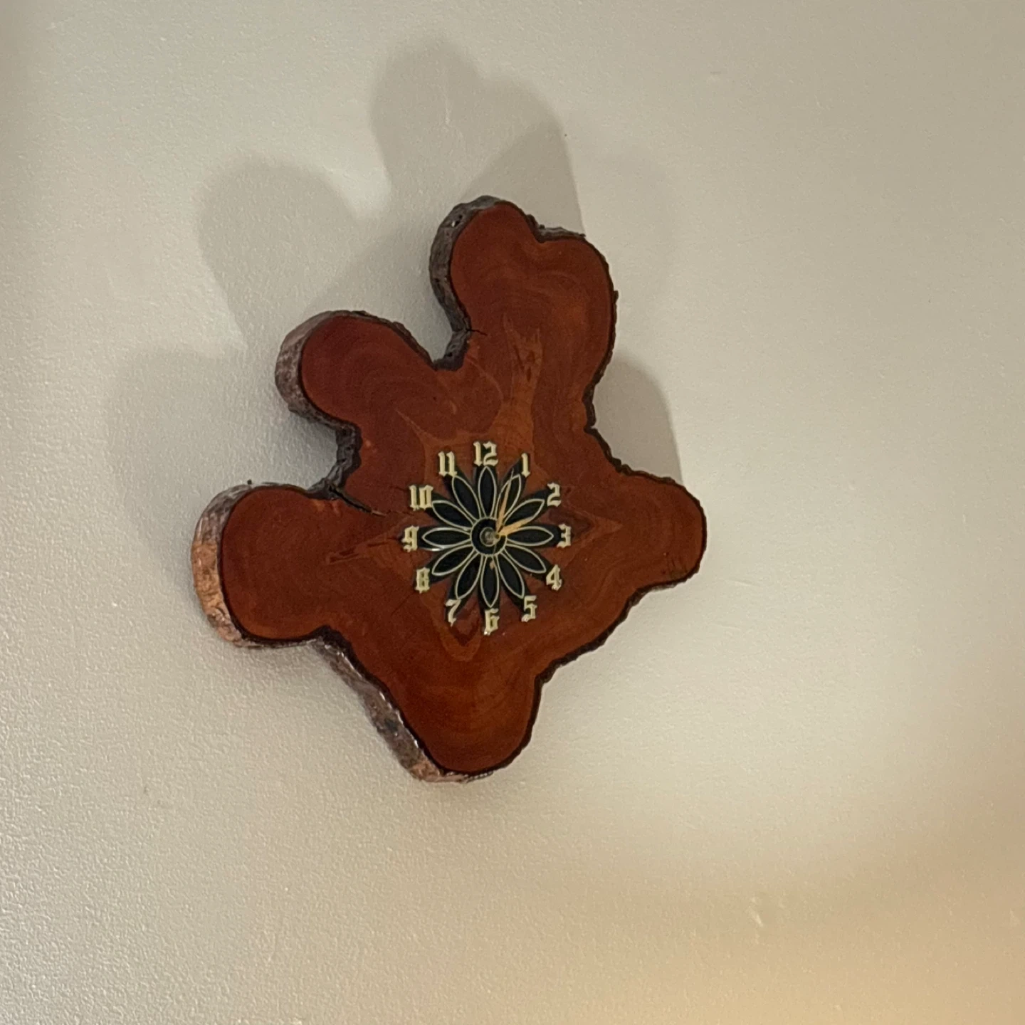 A unique wall clock crafted from a live edge wood slice. It features a decorative design in the centre with black hour markers. This clock's natural wood grain and irregular shape add a rustic charm to any room. Wood material.