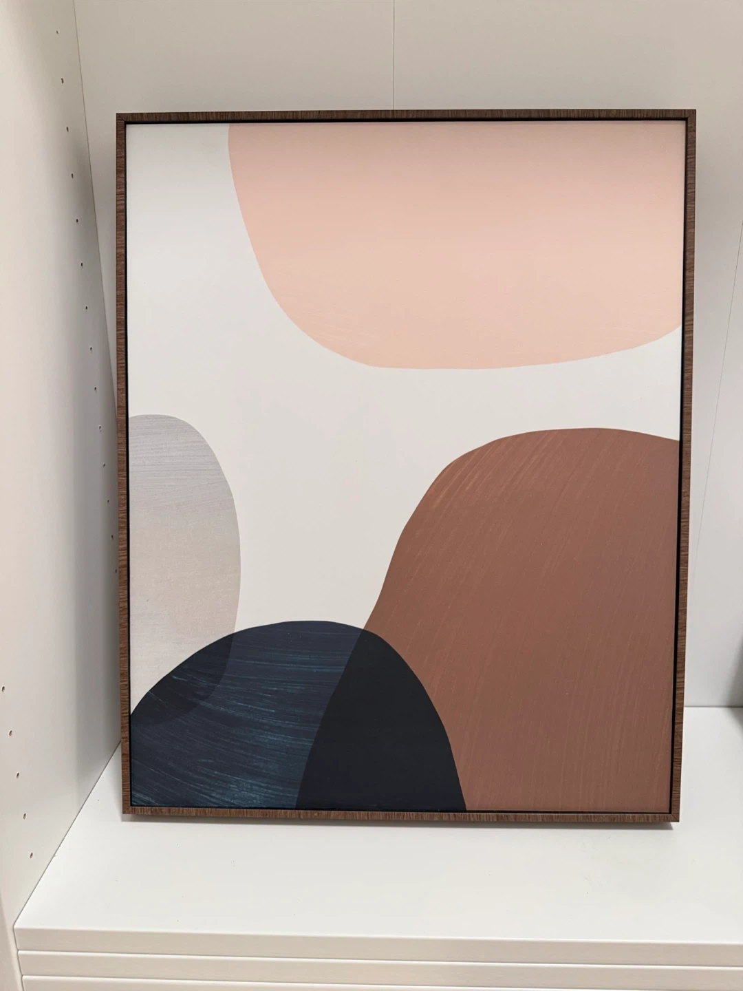 A framed art print featuring abstract shapes in blush pink, terracotta, and deep blue. It's encased in a dark wood-look frame. This piece is ready to hang and adds a modern touch to any room.