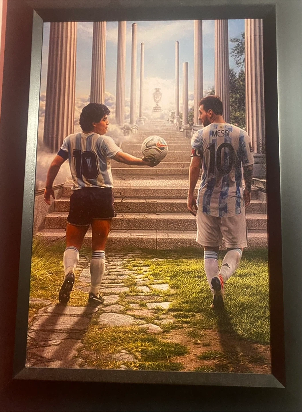 Awesome framed art print featuring football legends Diego Maradona and Lionel Messi. It's a great piece for any soccer fan's collection! Artwork is printed on quality paper.
