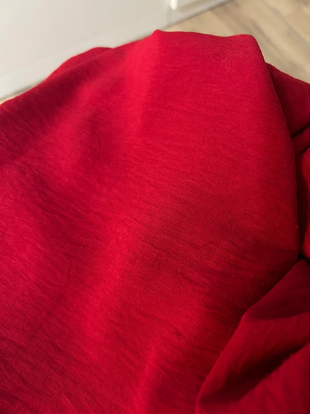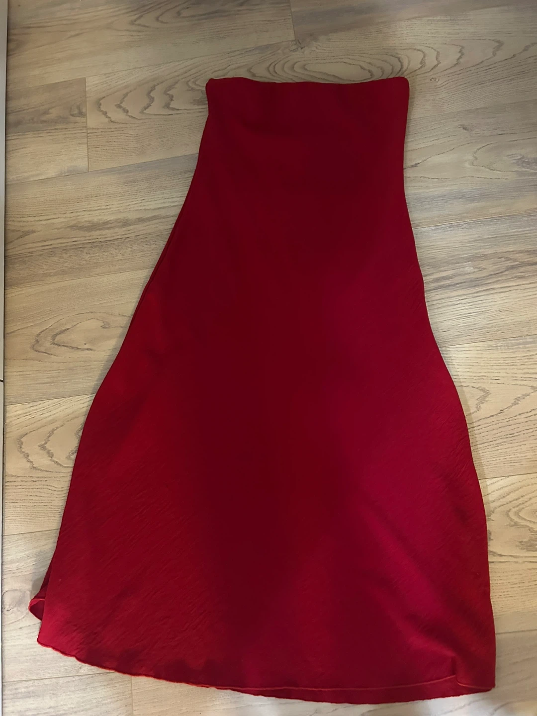 A flowing red strapless maxi dress. It's made of a lightweight, textured fabric that drapes beautifully. This dress is perfect for summer evenings or special occasions!