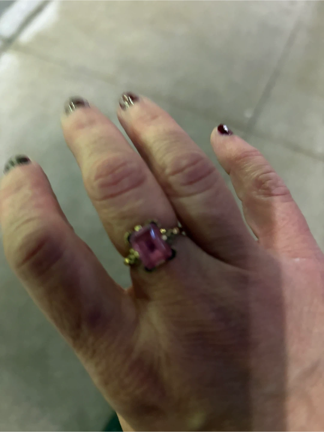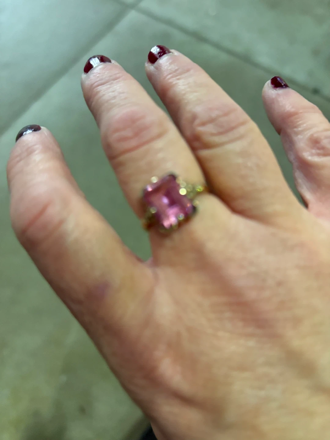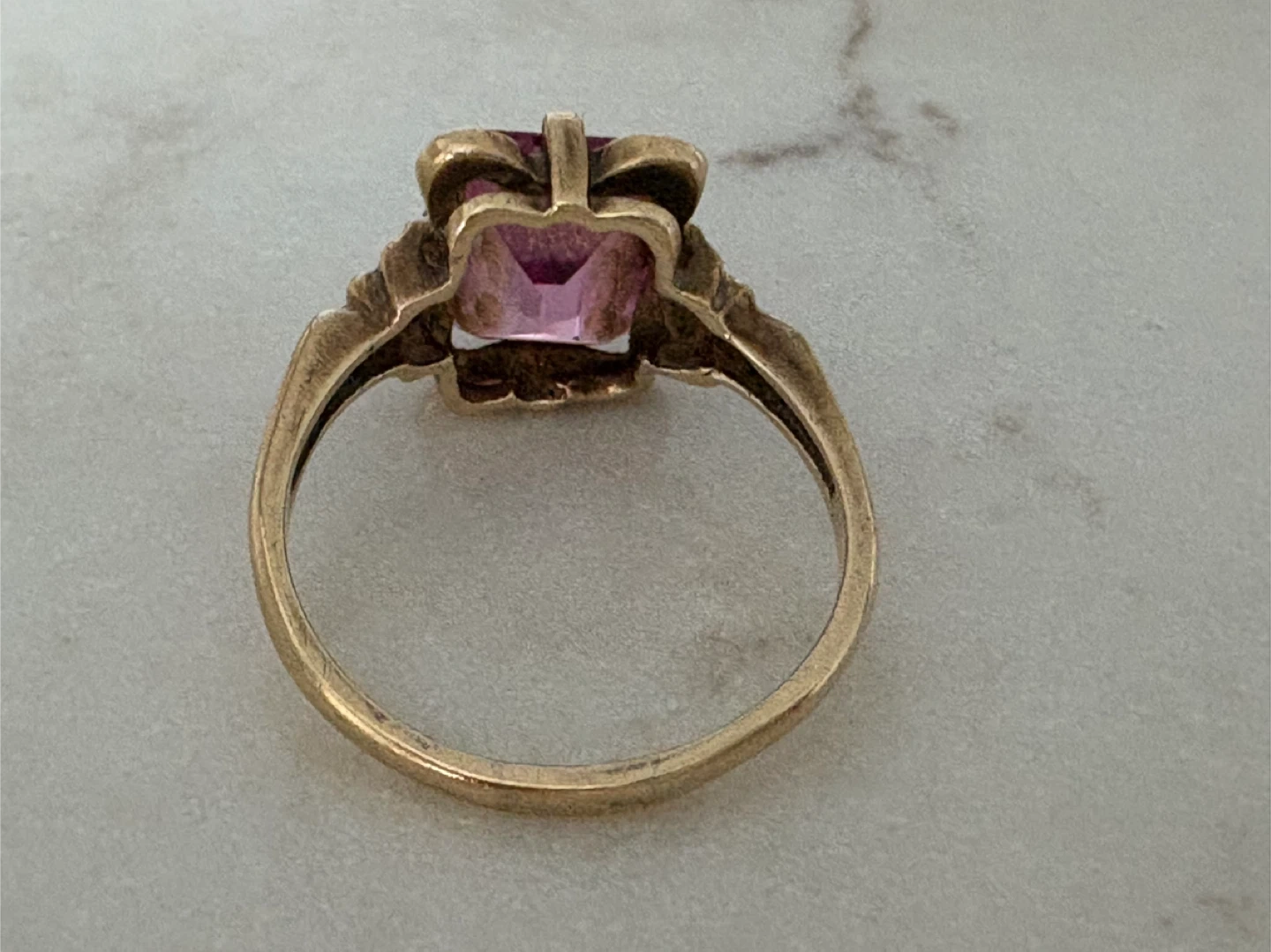 Beautiful Vintage 70s SID-BAR Emerald Cut Synthetic Pink Spinel & 10K Yellow Gold Cocktail Ring