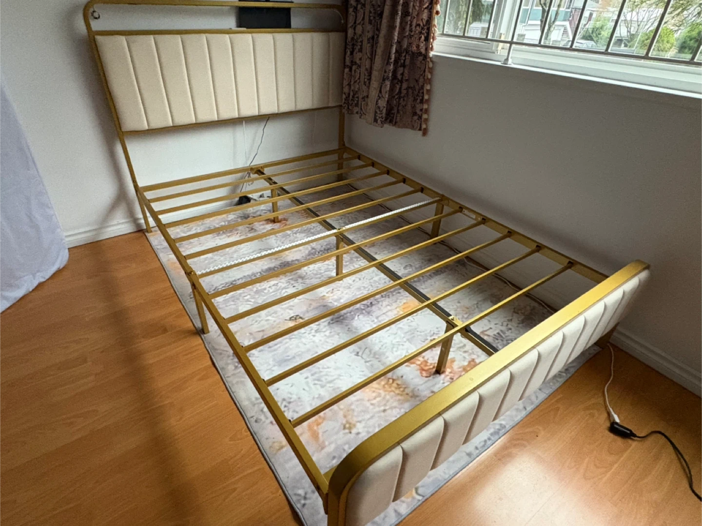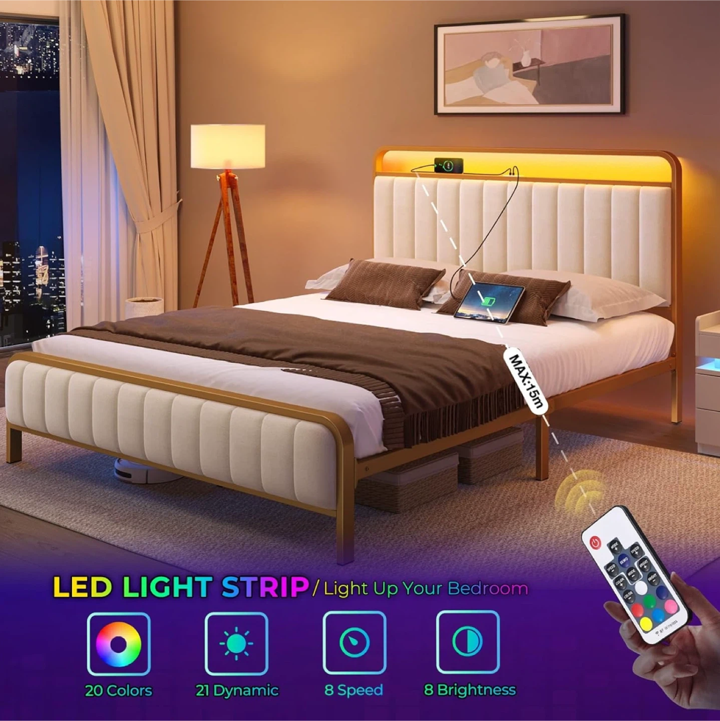 LED light strip to light up your bedroom! It features 20 colours, 21 dynamic modes, 8 speeds and 8 brightness settings, all controlled by a remote. The bed frame measures 78.1" x 53.9" x 44.5". It also includes a USB charging station and under-bed storage space.