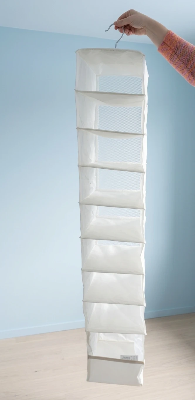 A white fabric hanging organizer with multiple compartments. It's made of breathable material and has a hook for easy hanging. Great for storing clothes, accessories, or small items in a closet or on a rack.