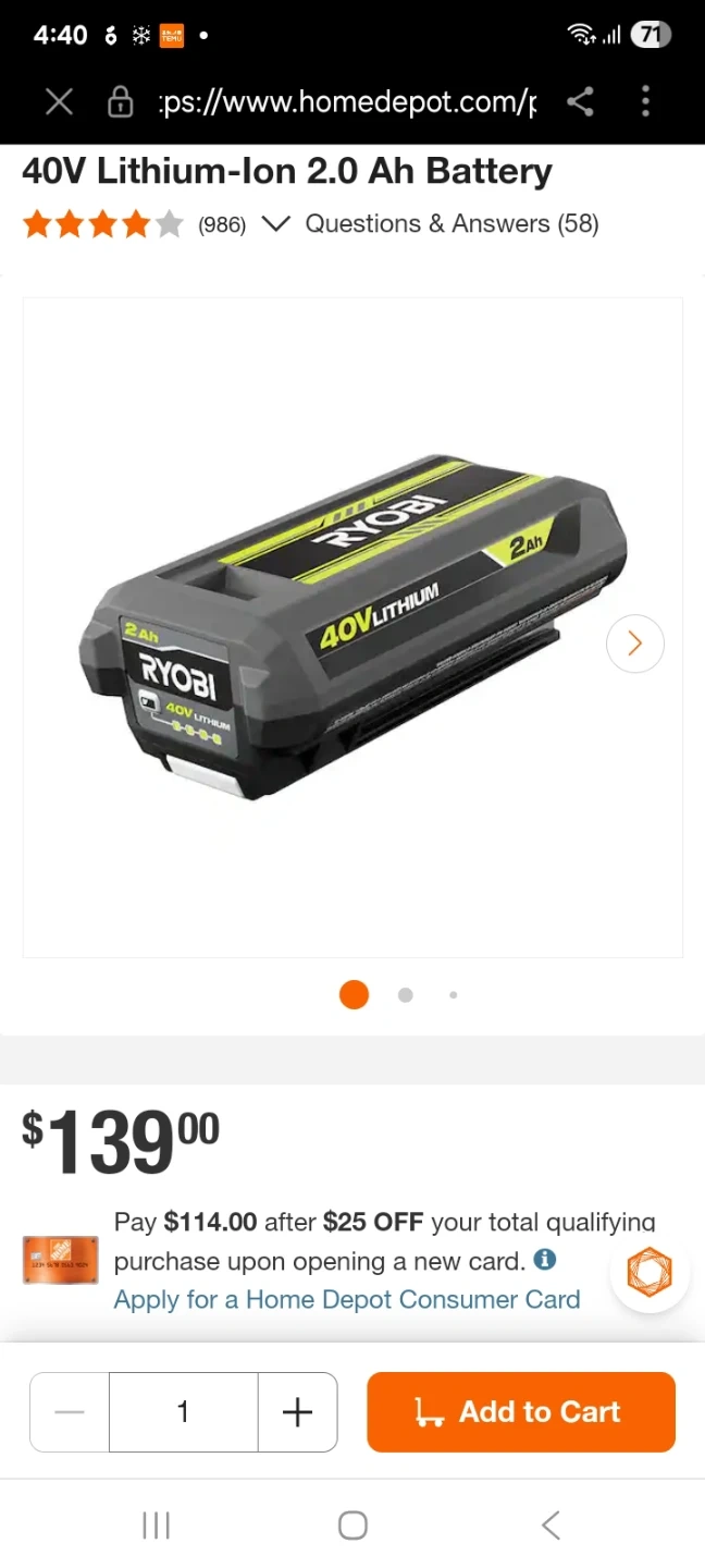 Ryobi 40V Lithium-ion 2.0 Ah Compact Battery