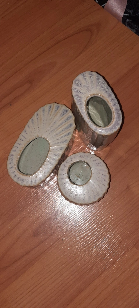 Selling a set of three ceramic candle holders. They have a unique, textured design and would look great as a centrepiece or on a mantel. They are in good condition and ready for a new home!