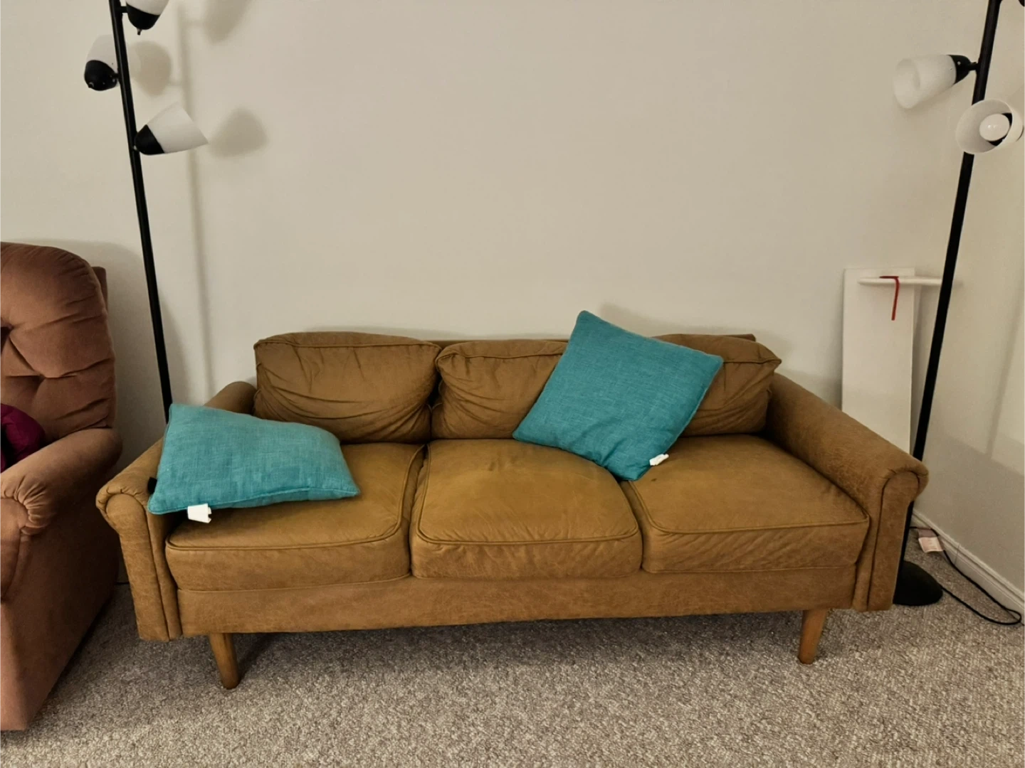 Comfortable brown sofa. It comes with two teal decorative cushions. Wood legs. Perfect for a small living room or den!