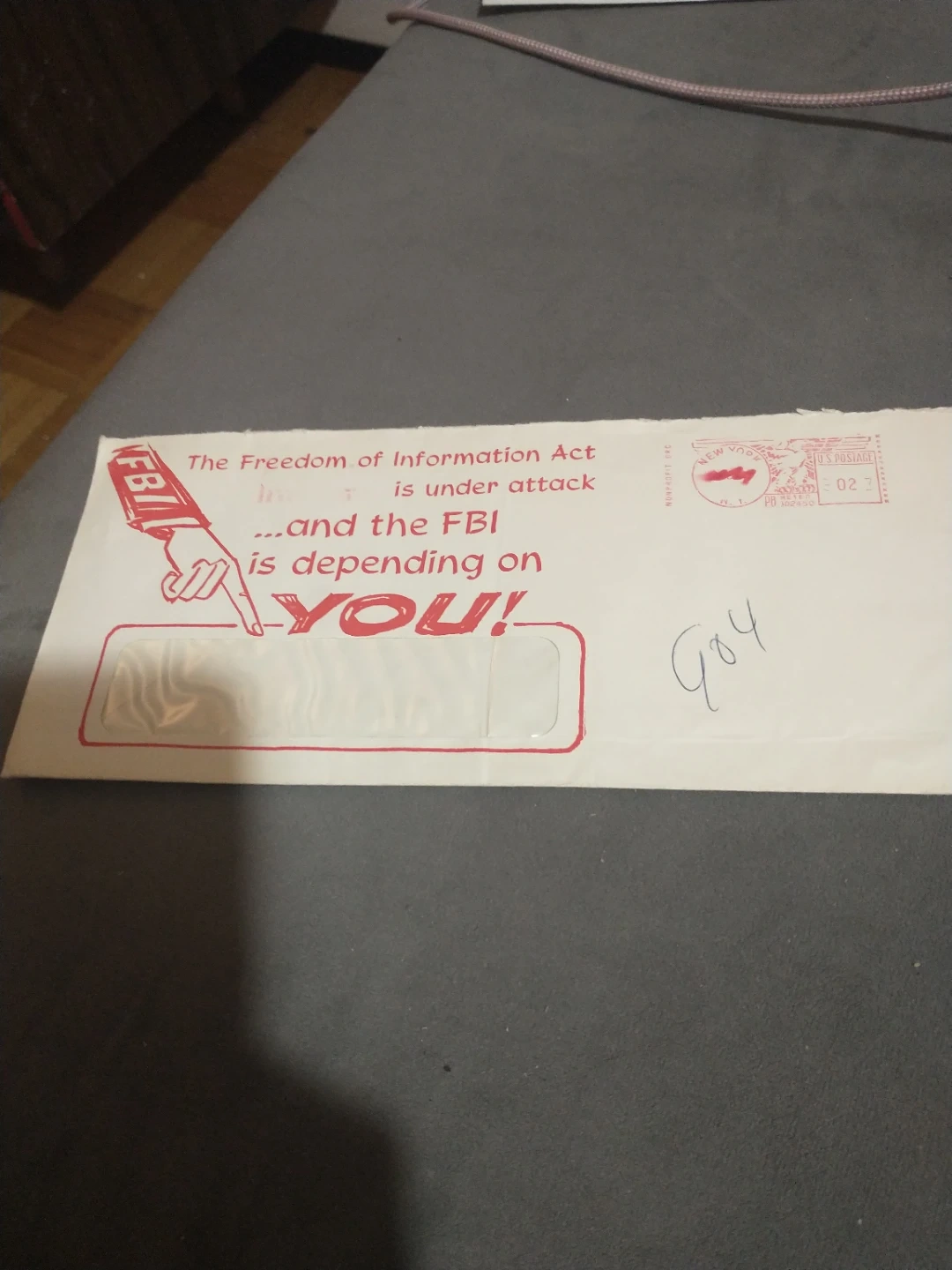 1970s FBI fundraising envelope NYC to Miami. The redacted postage meter date has been marked out with red ink. FBI, eh? In box 5.