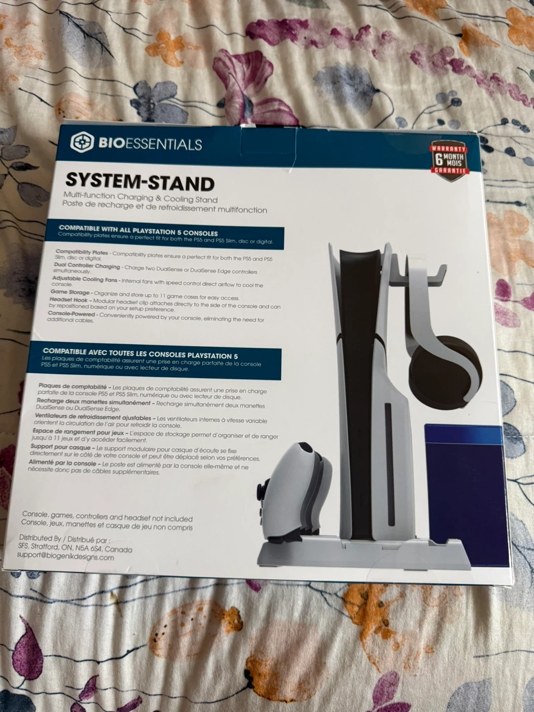 Selling a brand new BioEssentials System-Stand for the Playstation 5! This multi-function charging and cooling stand is perfect for keeping your console organized and cool. It features dual controller charging, a headset hook, and cooling control. Originally bought for $59.99 + tax. Box included!