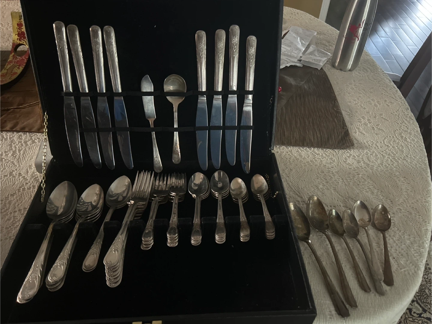 This is a silverware set for six. It includes dinner knives, dinner forks, soup spoons, and dessert spoons. There's also a butter knife and serving spoon. These would be nice for special occasions!