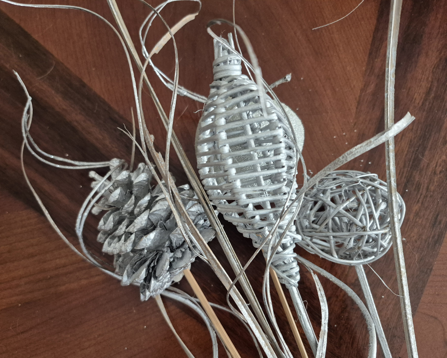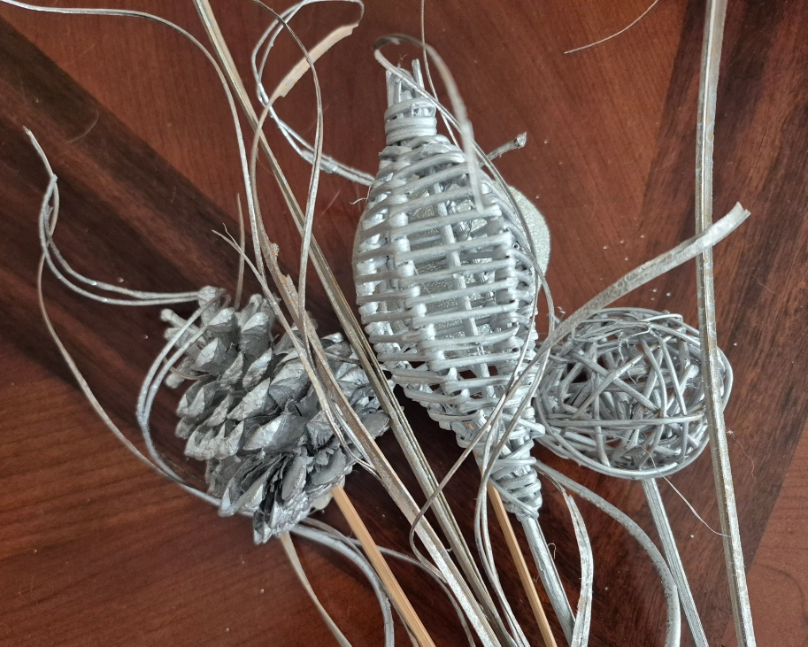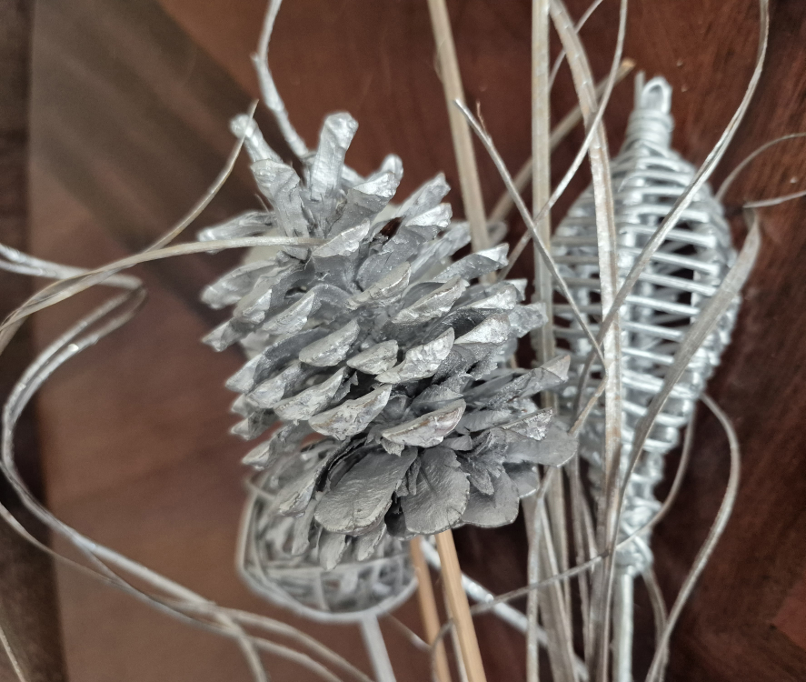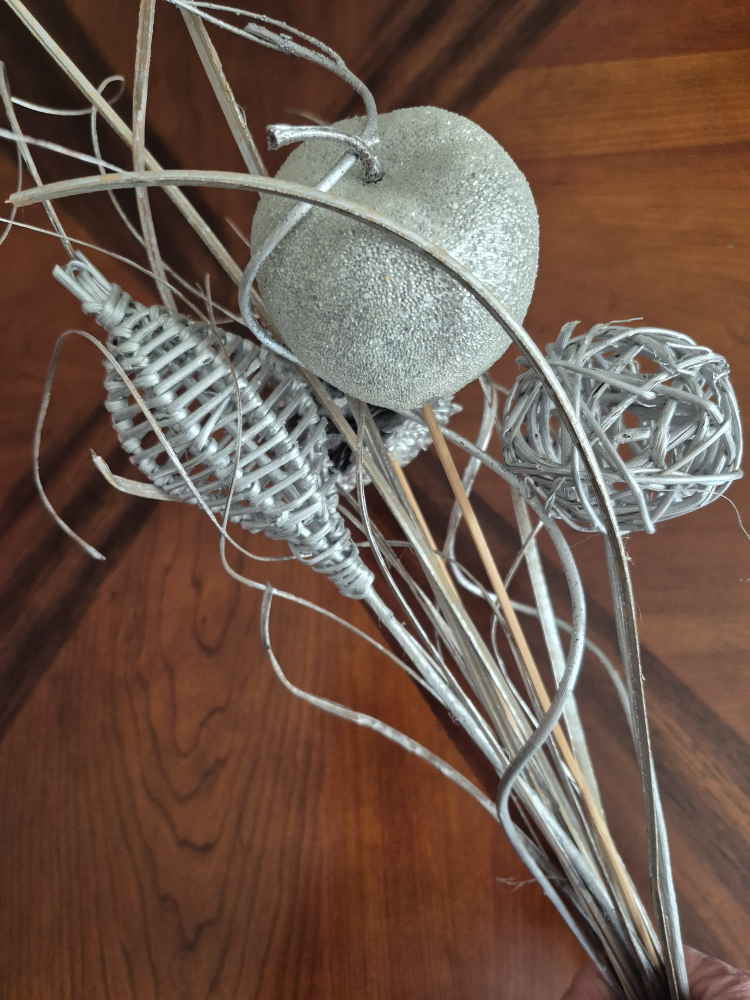 These charming silver decorative floral arrangement pieces are perfect to add a touch of elegance. The arrangement features a mix of a silver pine cone, a silver woven ball, a silver sparkly apple and a woven bullrush as well as curled delicate branches, all bundled together for a cohesive and stylish look. Perfect by itself or to add to another arrangement.