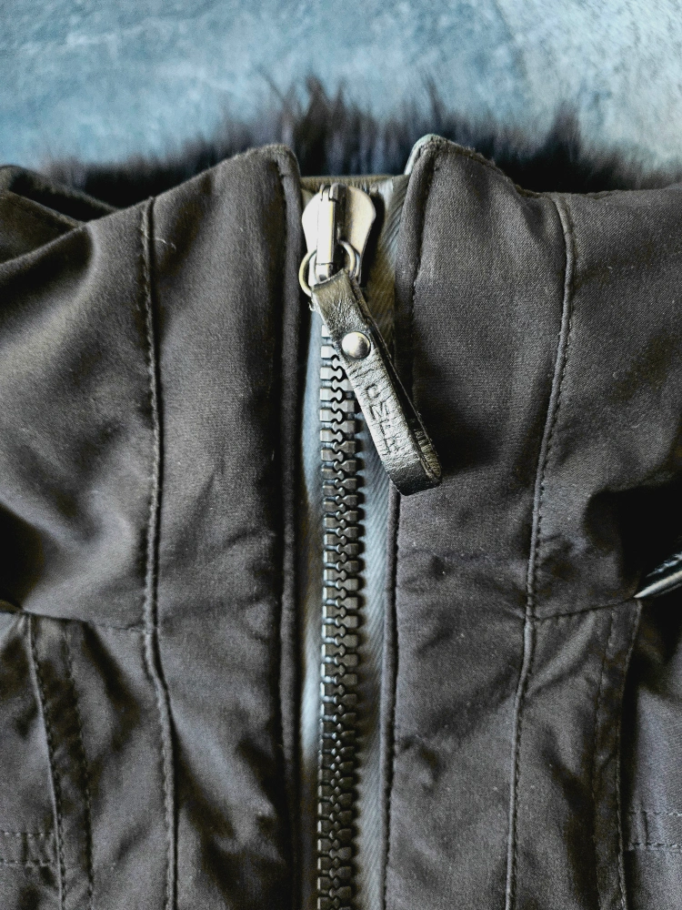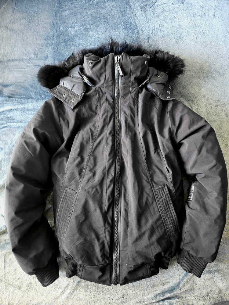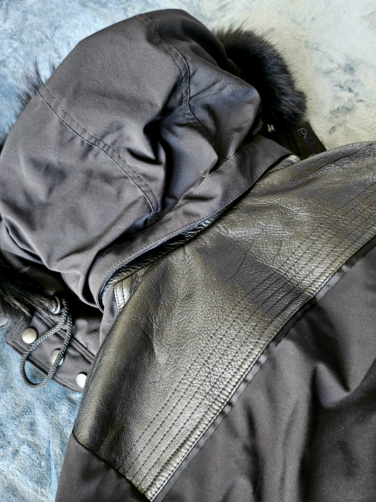 β’ Detachable hood with removable black rabbit fur trim.