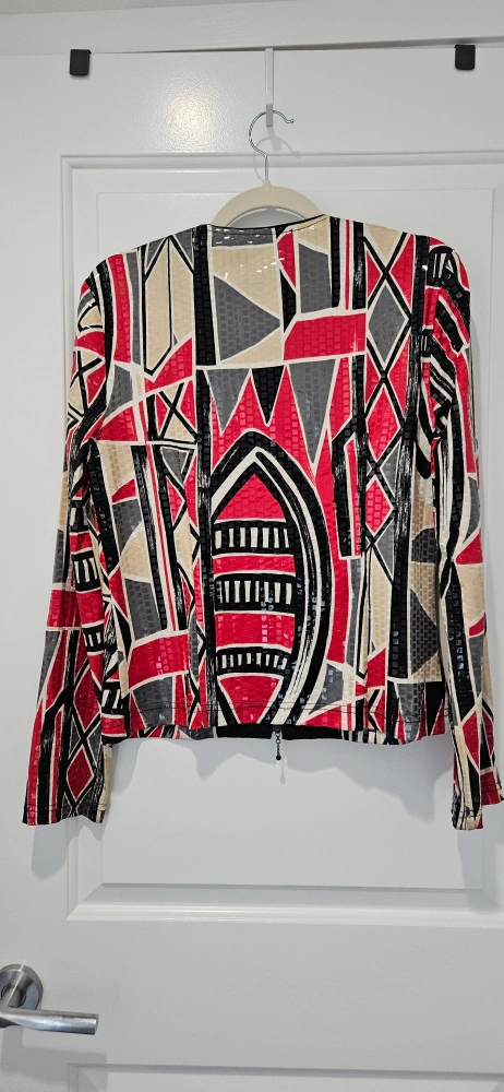 This is a fun and unique top with a bold geometric pattern in size Medium. The colours are red, black, grey, and beige. It's in fantastic condition and ready for a new home! Perfect for the Christmas and holiday season!