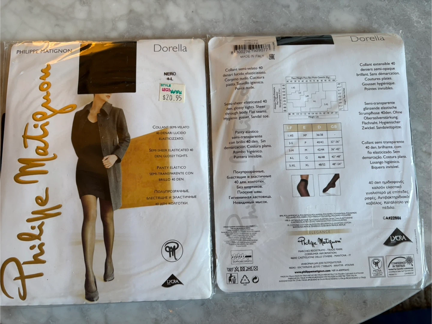 4 Philippe Matignon Dorella tights available in size 4L and 3M. These are semi-sheer, 40 denier tights. The original price was $20.95. Packages unopened. $15 each or all 4 for $50 Available in Nero, Cappuccino and Anthracite. Pickup at King St W and Shaw