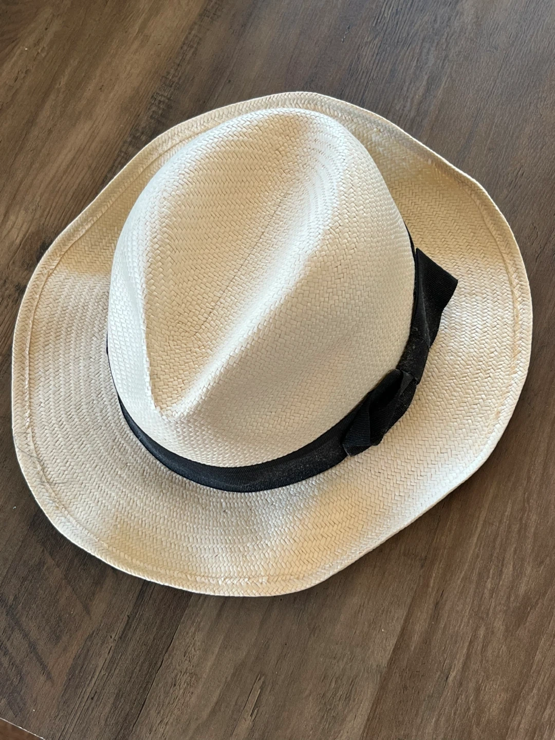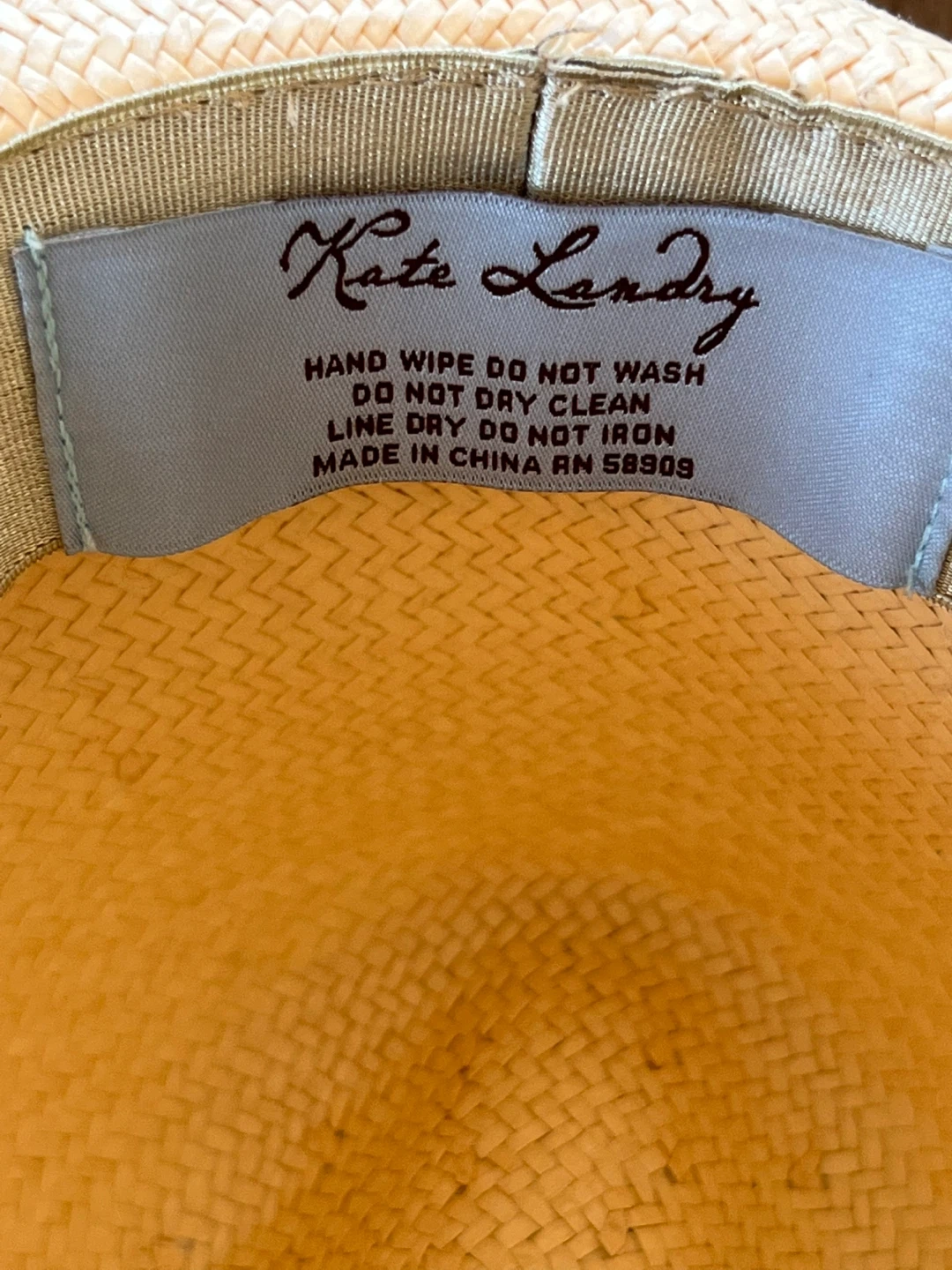 Selling a Kate Landry straw hat. It's in great condition and would be perfect for sunny days. The hat features a stylish black ribbon detail. Just a heads up, the care instructions say to hand wipe only, do not wash, do not dry clean, line dry and do not iron