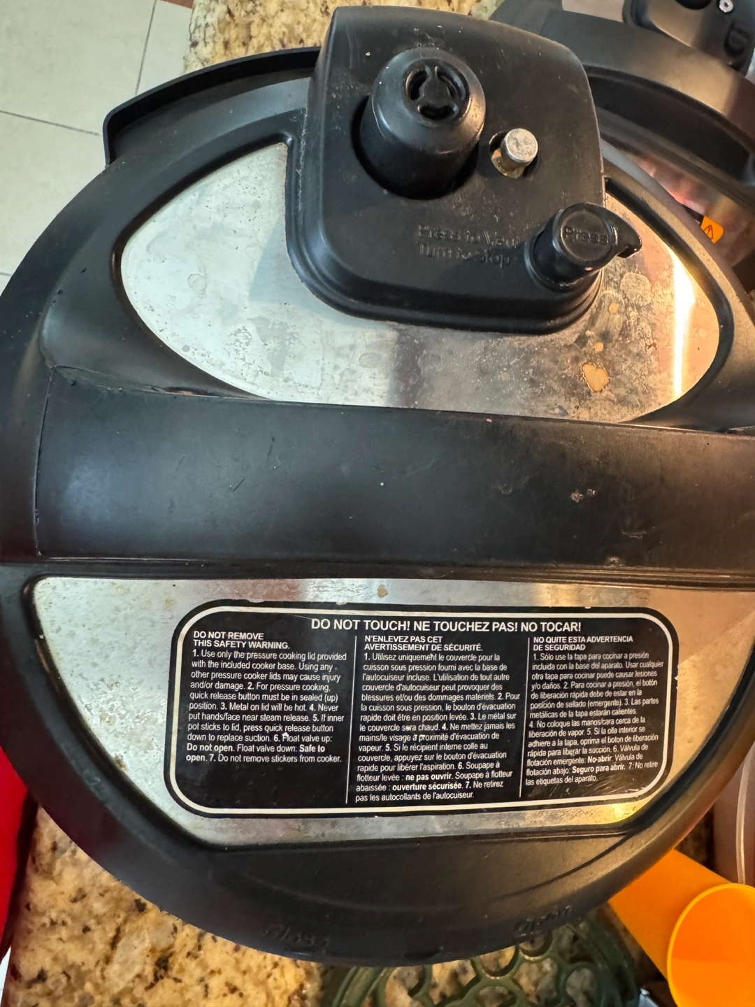 Giving away a pressure cooker lid. Please note the safety warnings and instructions on the lid. It's important to use only the pressure cooking lid provided with the included cooker base to avoid injury or damage. When pressure cooking, make sure the quick release button is in the sealed (up) position. Be careful, as the metal on the lid can get hot. Also, avoid placing hands or face near the steam release