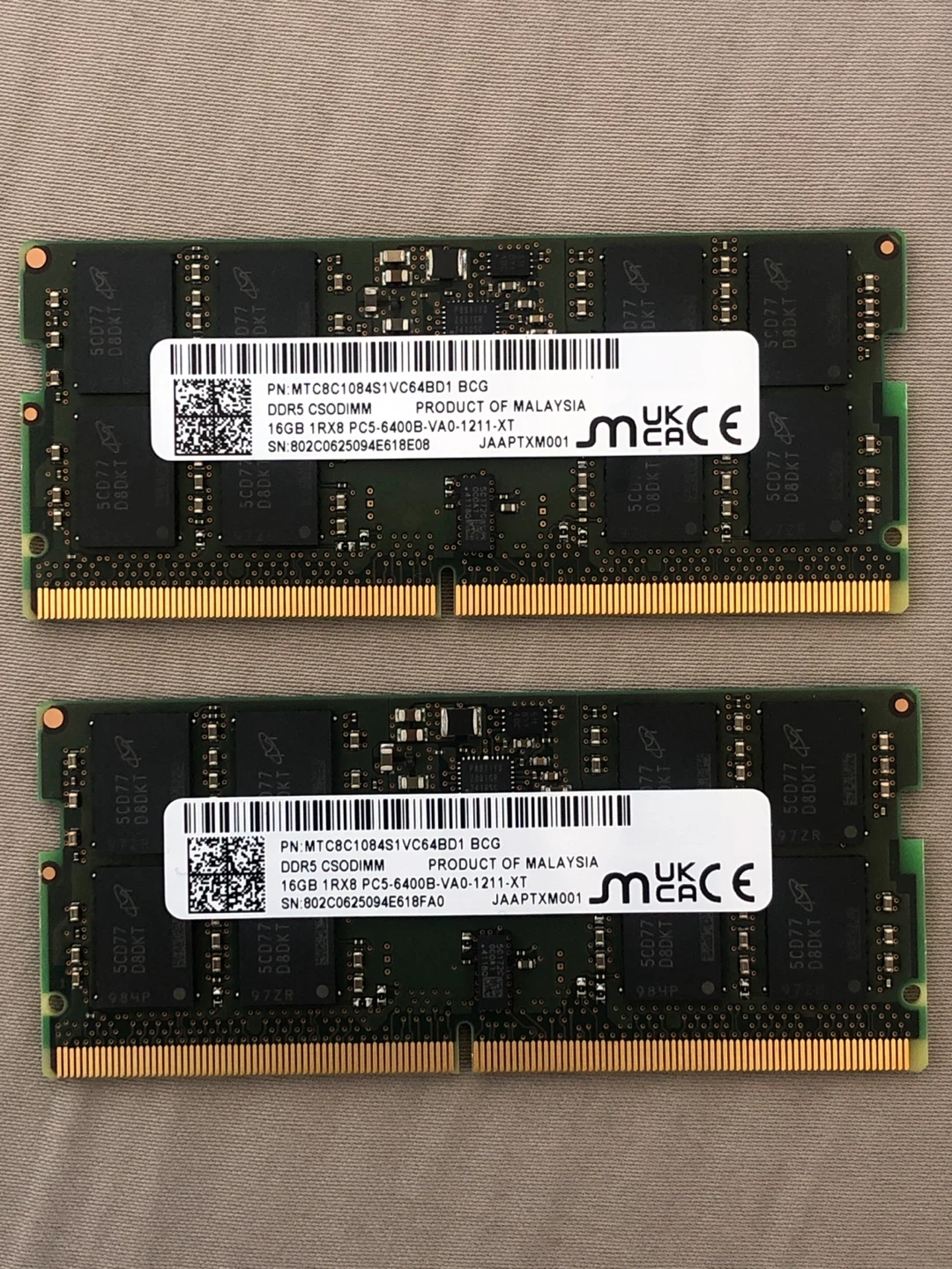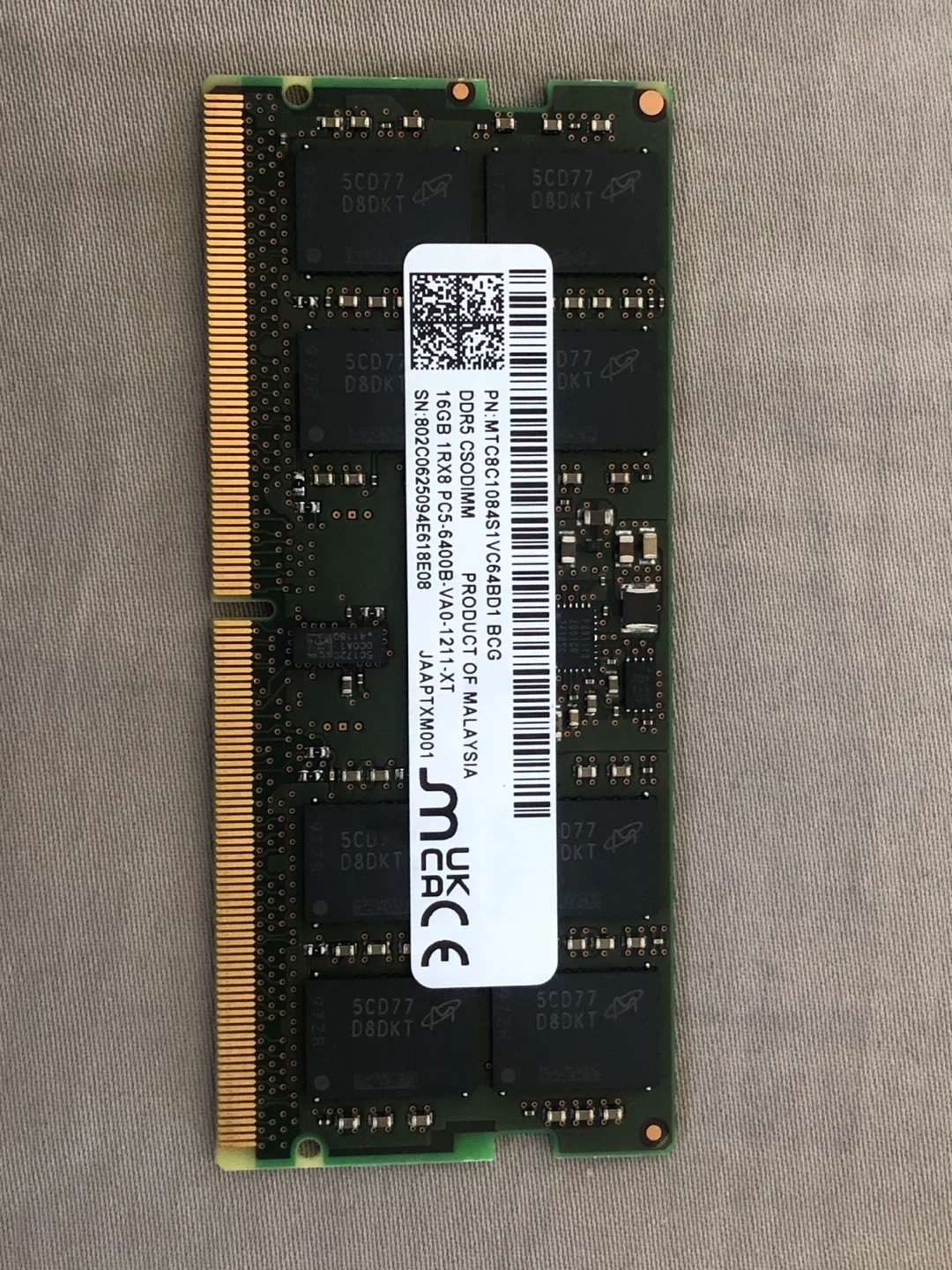 Selling Micron 16GB 1Rx8 PC5-6400B DDR5 CSODIMM RAM. This is a high-performance memory module perfect for upgrading your laptop or small form factor PC. It's in great condition and ready to use!