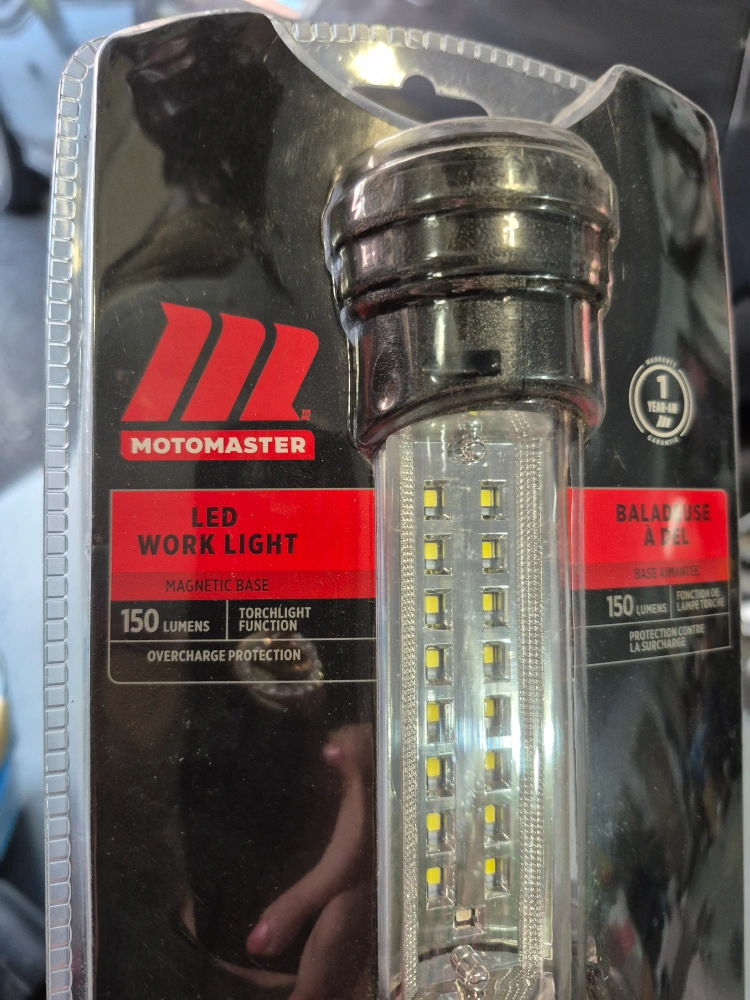Selling a brand new Motomaster LED work light! It features a magnetic base and a torchlight function. It has 150 lumens for bright illumination and overcharge protection. It also includes a rechargeable battery and a USB charging cable. Great for any workspace!