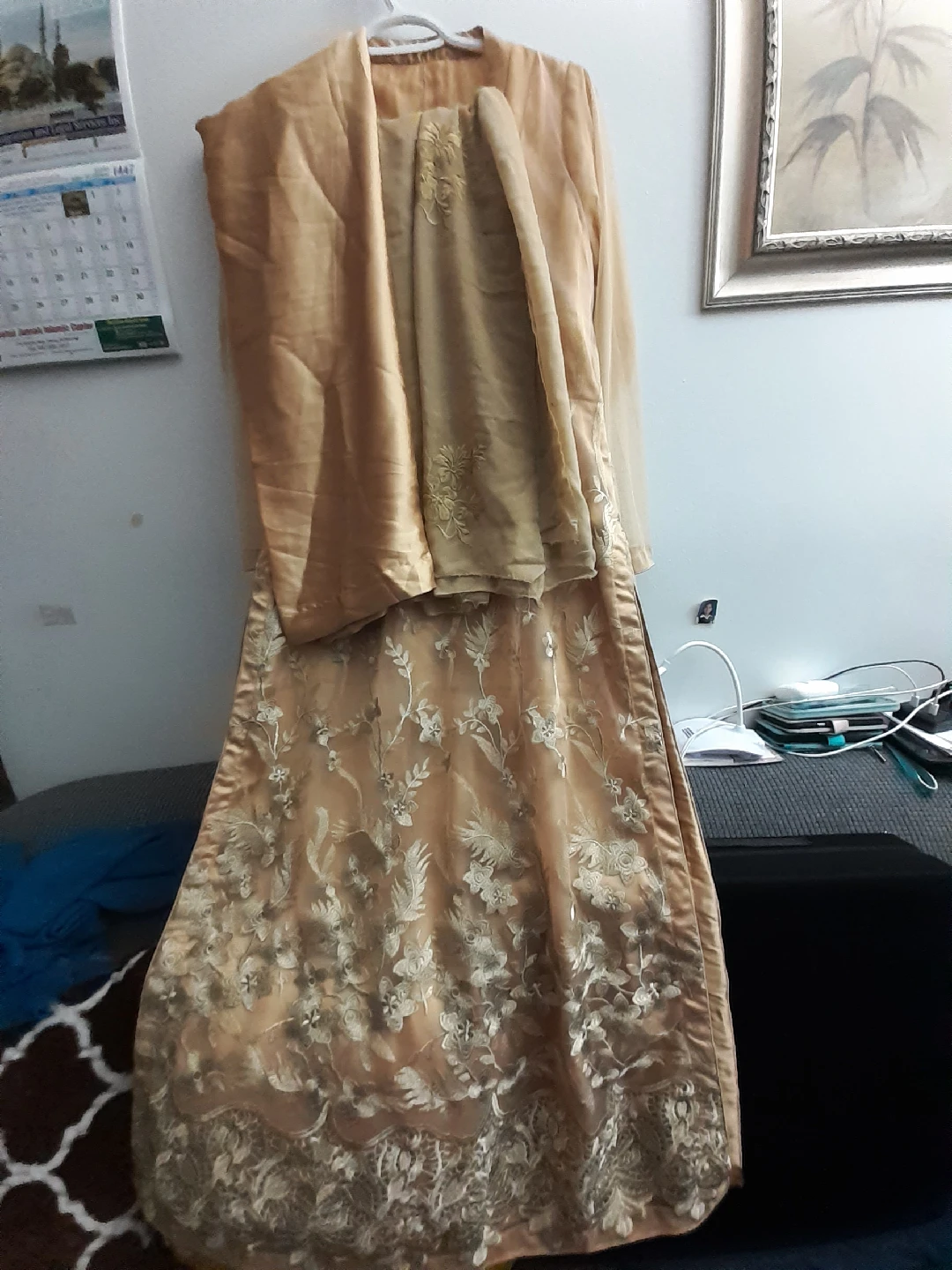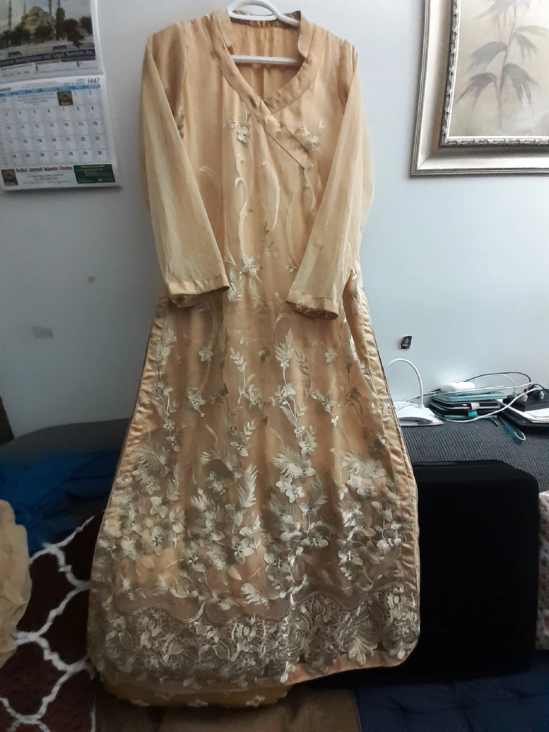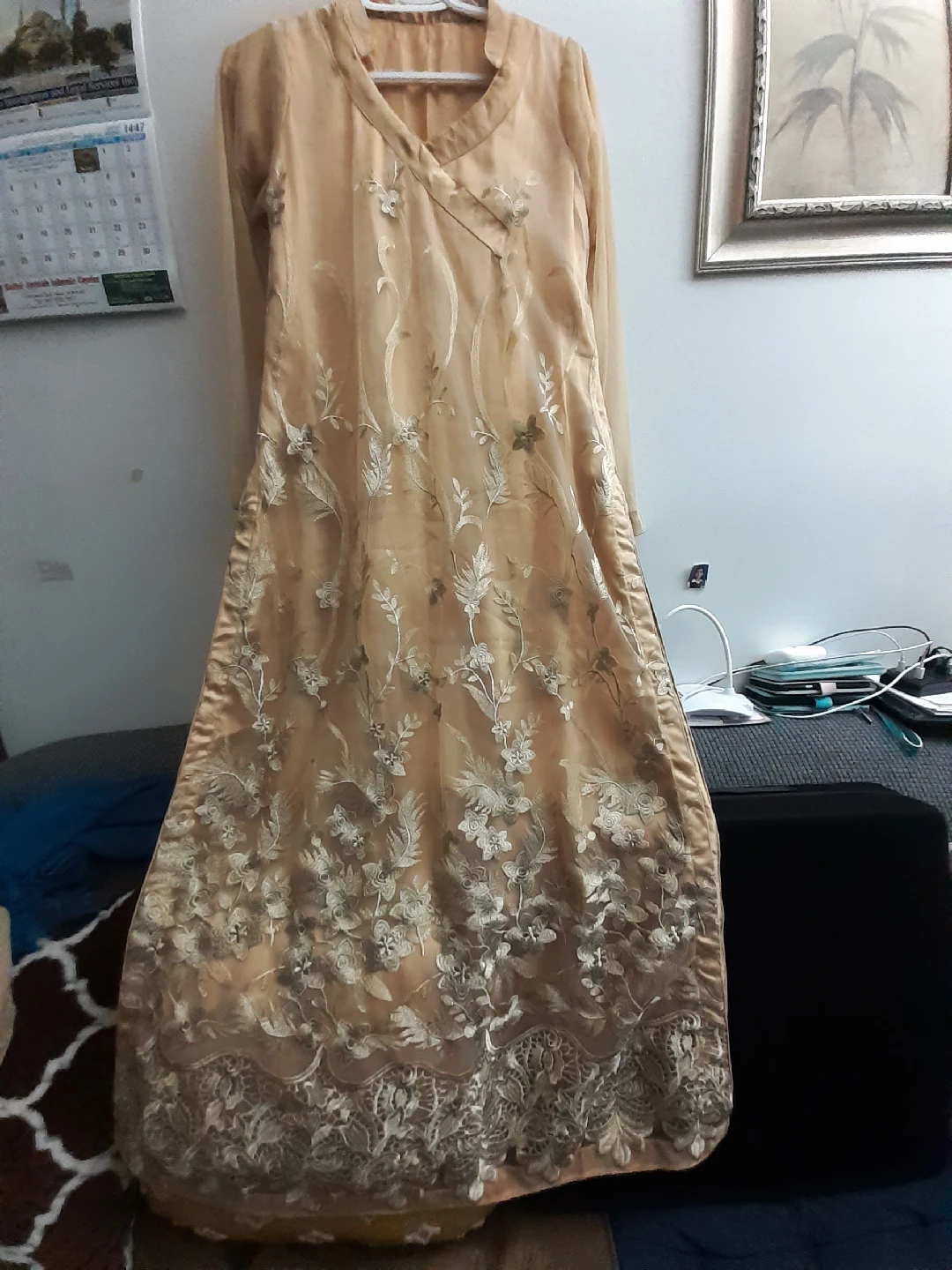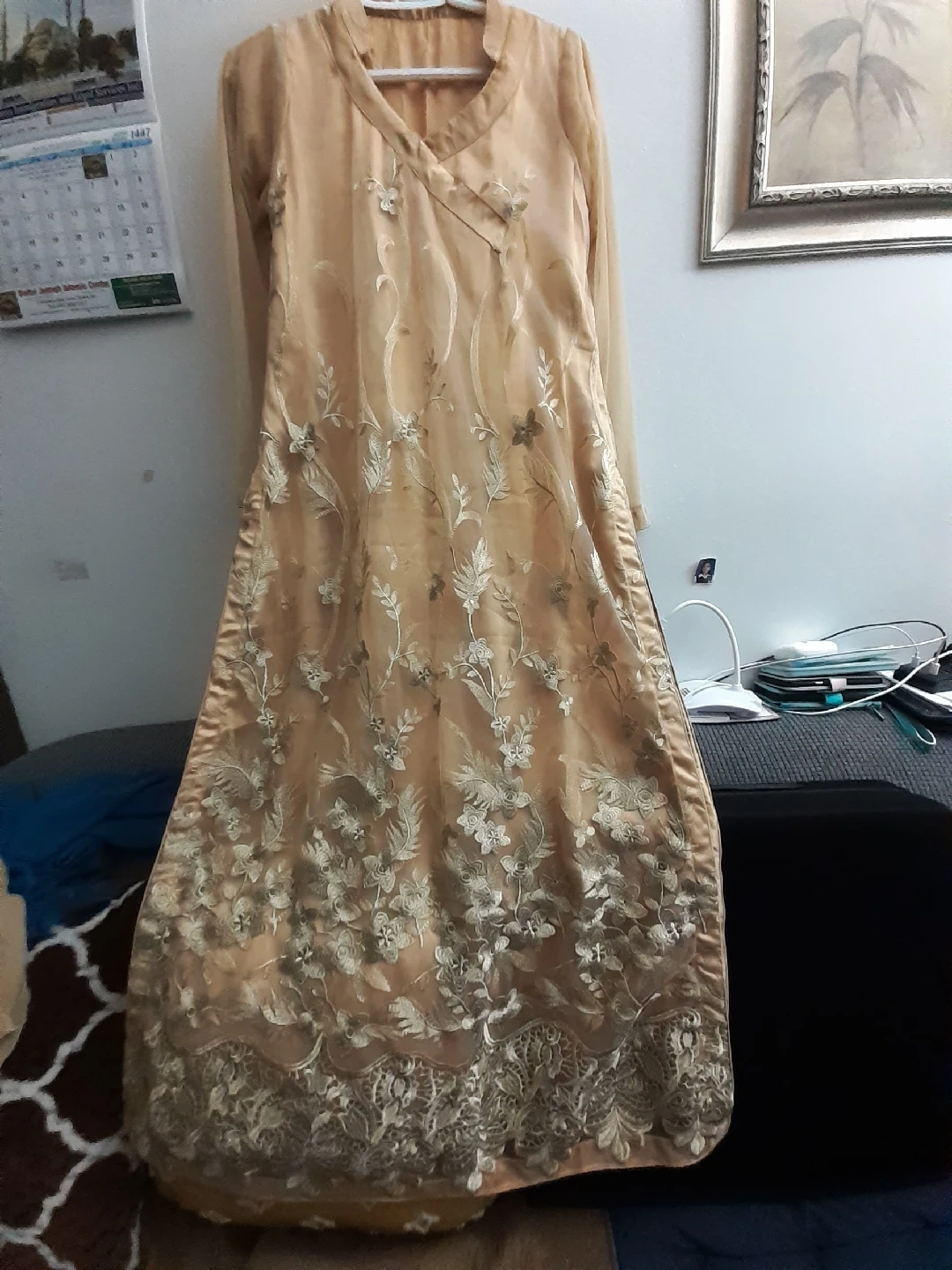 Beautiful Pakistani salwar kameez with delicate embroidery. This elegant outfit is perfect for special occasions or adding a touch of cultural flair to your wardrobe. The fabric has a lovely sheen and the embroidery is intricately detailed. It's in great condition and ready to wear! medium to make LARGE fully embroidery works $45 only used 1time very beautiful colors and works check my other listings please