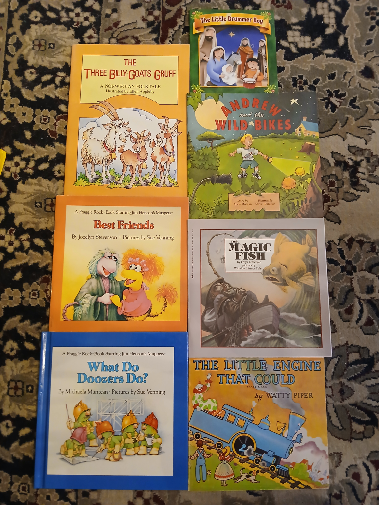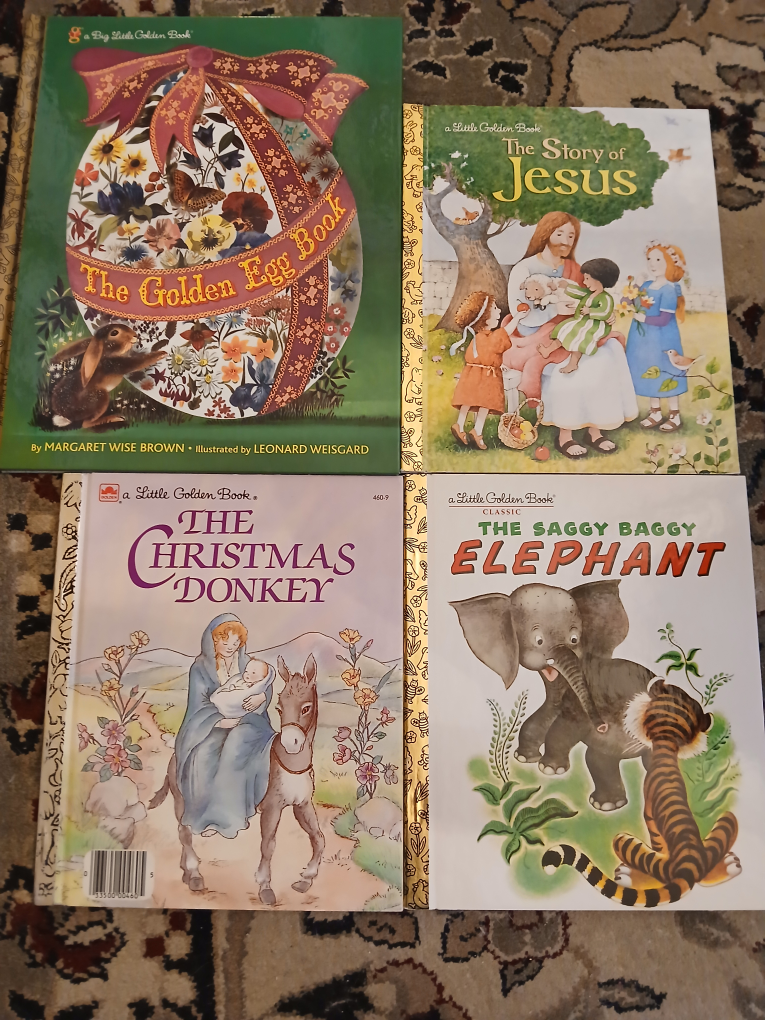 PILES of kids books, both board books and pages, plus some Little Golden Books. Some classics, some new stuff. Any two for $1.