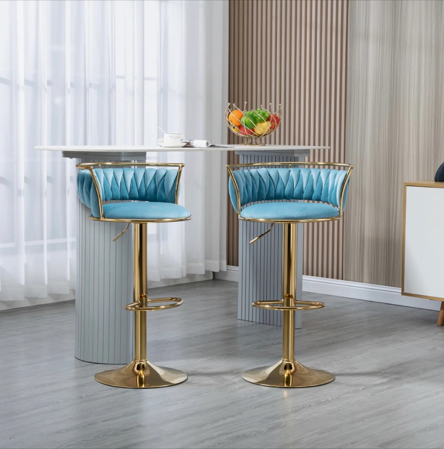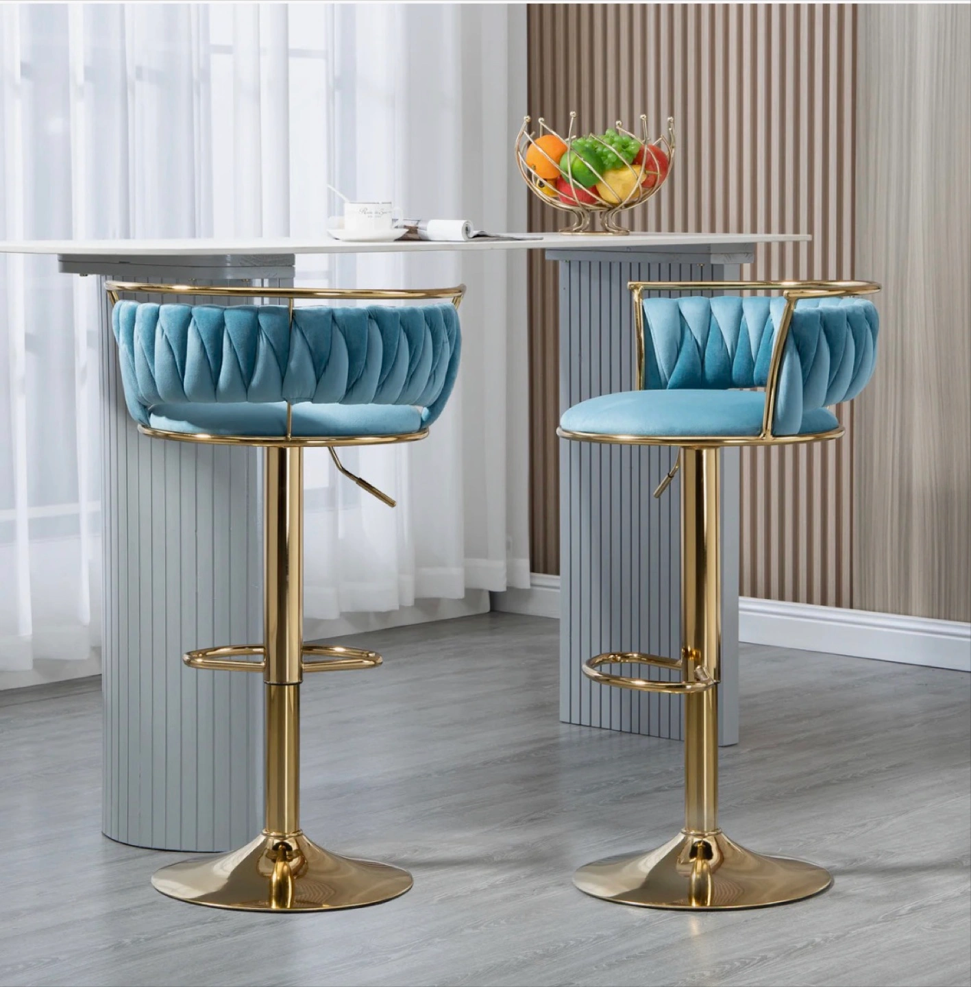 Misty Blue Velvet Swivel & Adjustable Height Stools, Set of 2