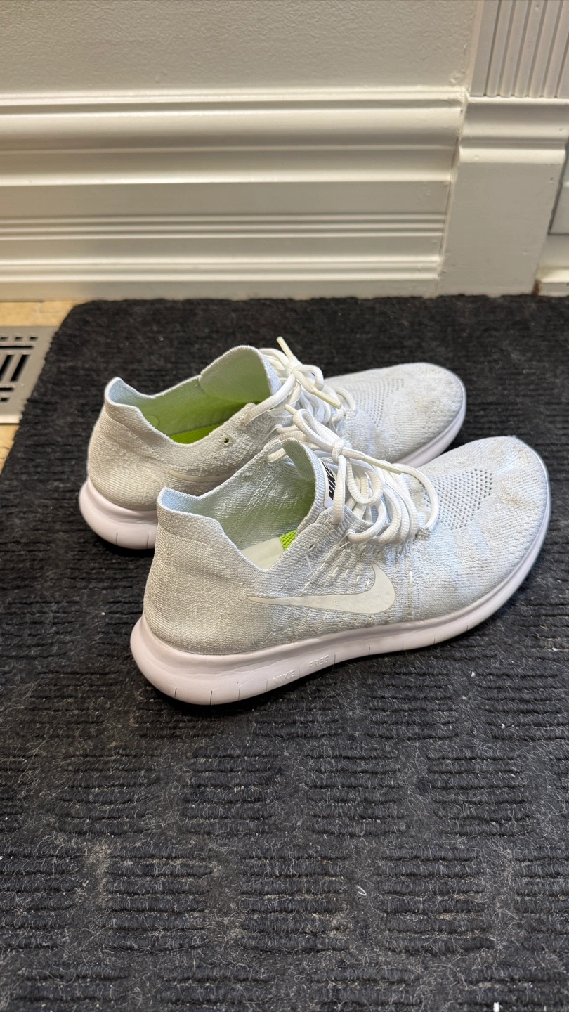 Selling a pair of Nike Free RN Flyknit running shoes in white. They show some signs of wear but are still in good condition for running or casual wear. Perfect for someone looking for a lightweight and flexible running shoe! Size 7.5 women!
