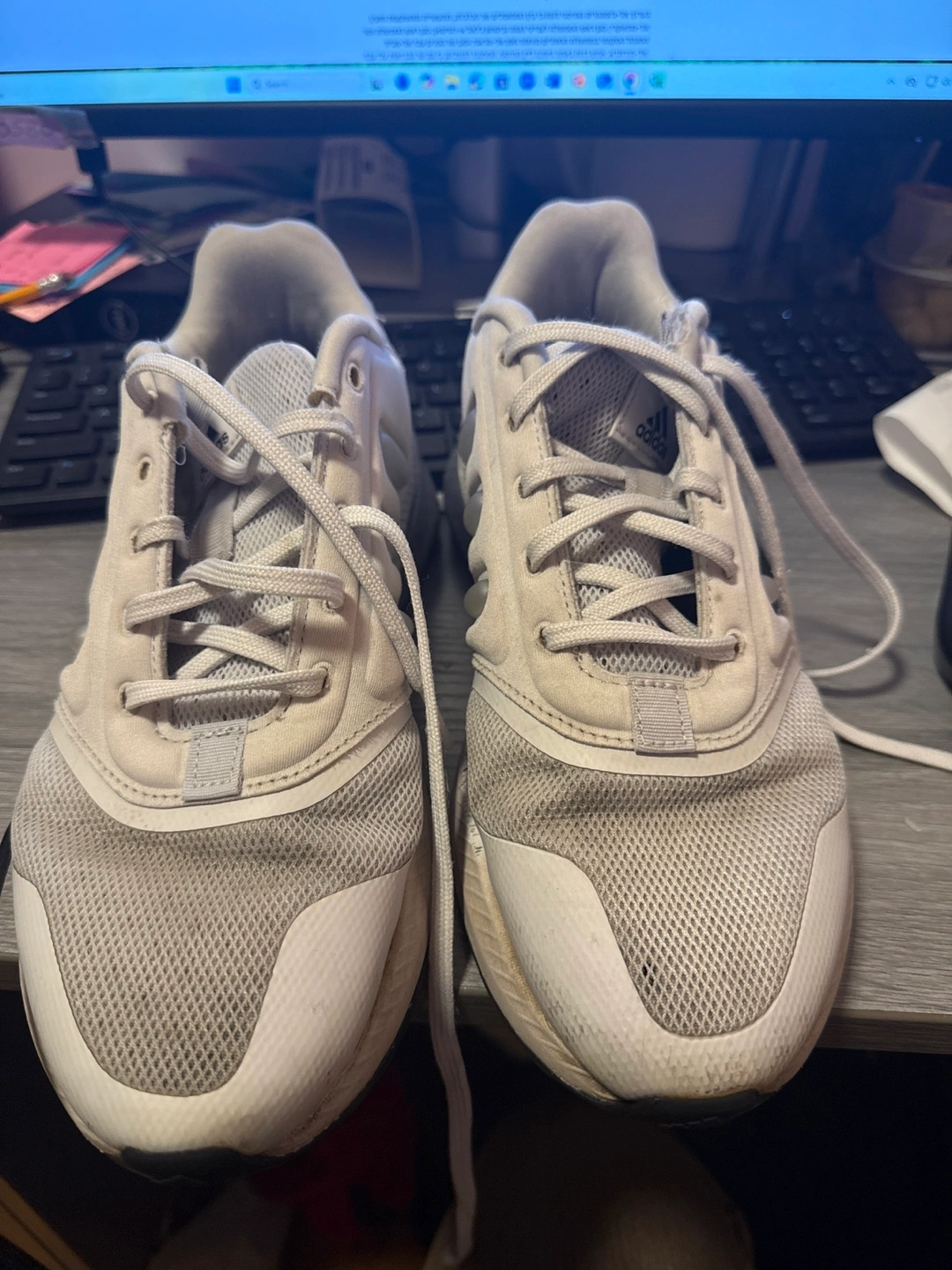Selling a pair of Adidas running shoes in US size 8. They show some signs of wear, but they are still in good condition for running or casual wear. The manufacturing date is 2023 March.