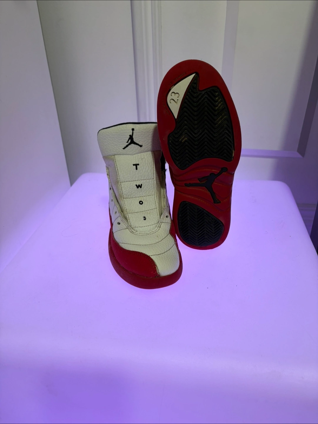 Selling a pair of Size 1Y Air Jordan 12 Retro Cherry shoes! They are red and white and have the number 23 on the heel. They’re in good condition and ready for a new home.