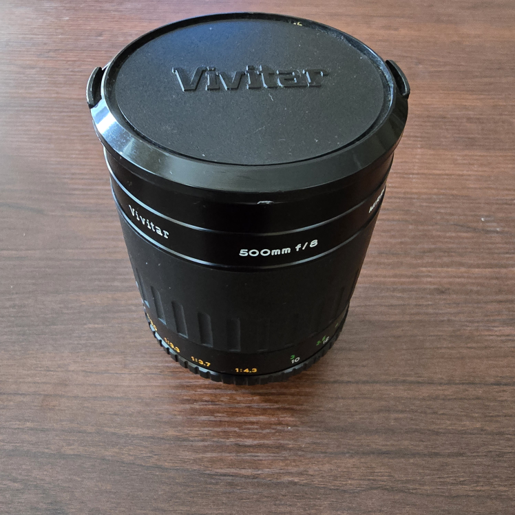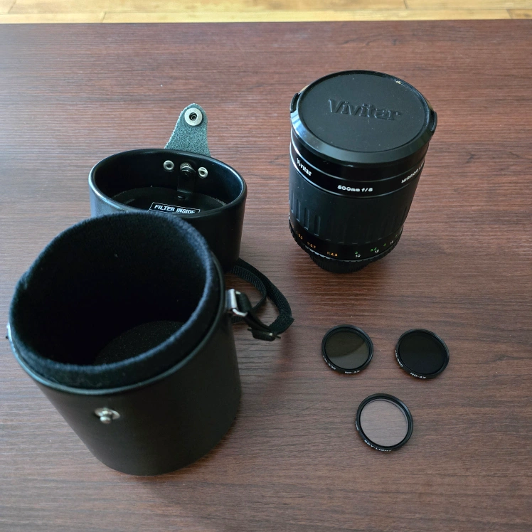 Selling a Vivitar 500mm f/8 lens. It comes with a set of filters including ND-2X, ND-4X, and SKY-LIGHT 1A. Also includes the original case for the lens and filters.