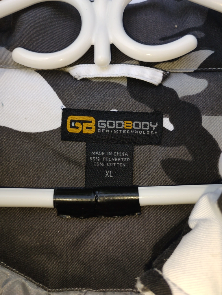 Selling a Godbody Denim Technology coverall in a cool camo pattern. It's an XL size and made of 65% polyester and 35% cotton. Perfect for staying warm and stylish!