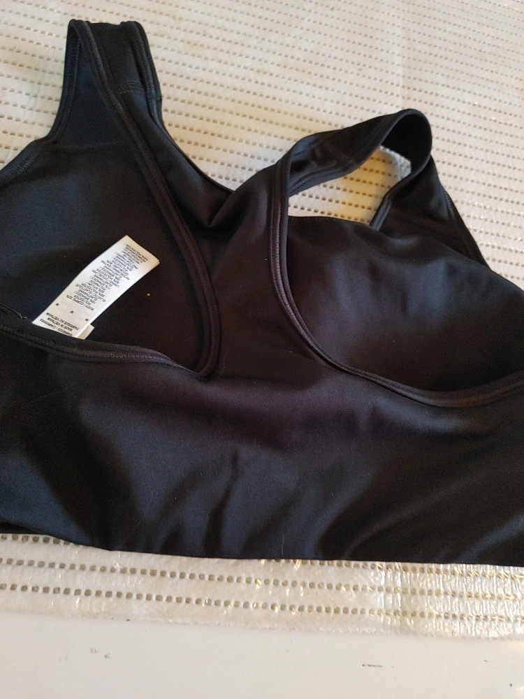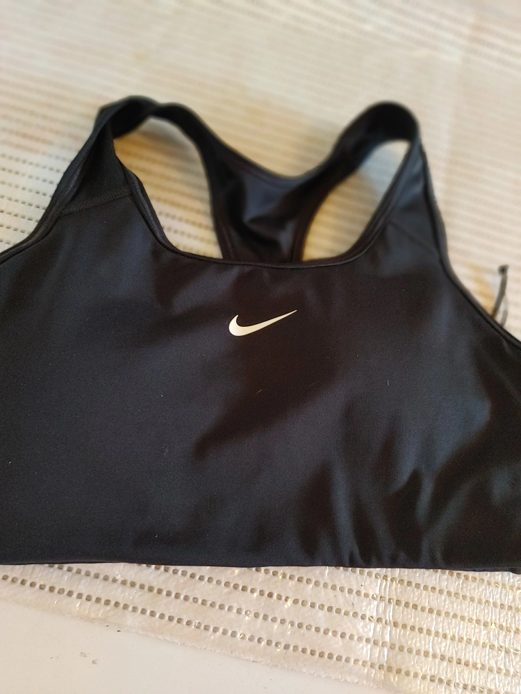 Selling a Nike sports bra in black. It's in great condition and ready for your next workout! The size is not specified, so please check the photos to ensure it will fit you well