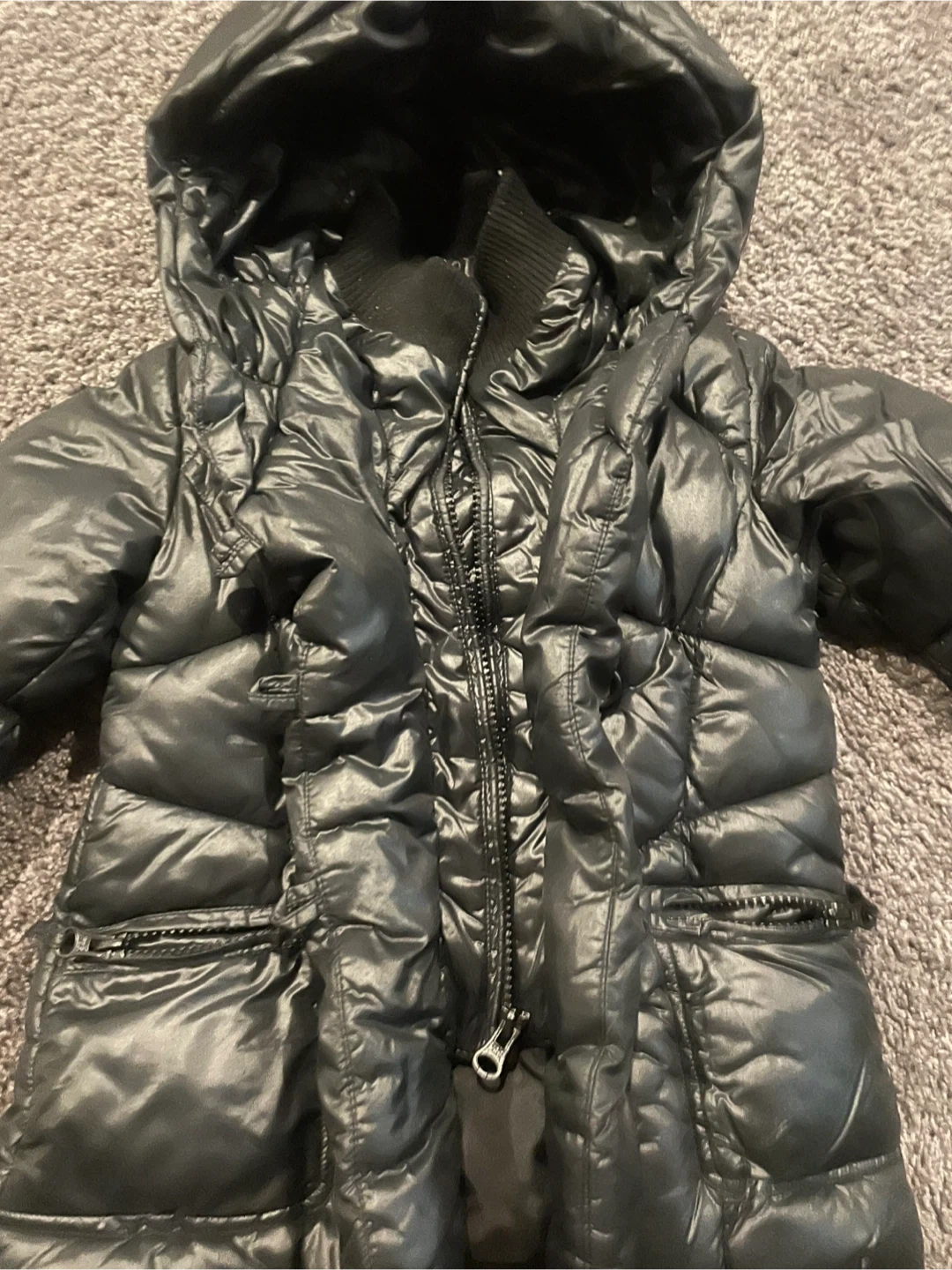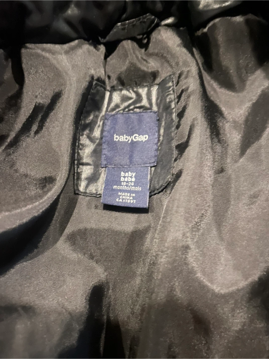 28Here's a babyGap puffer jacket in black, perfect for keeping your little one warm! The size is 18-24 months/mois. It's a great addition to their winter wardrobe!