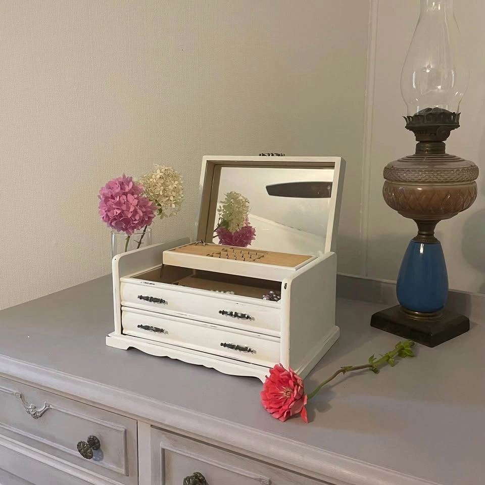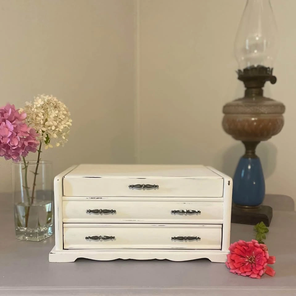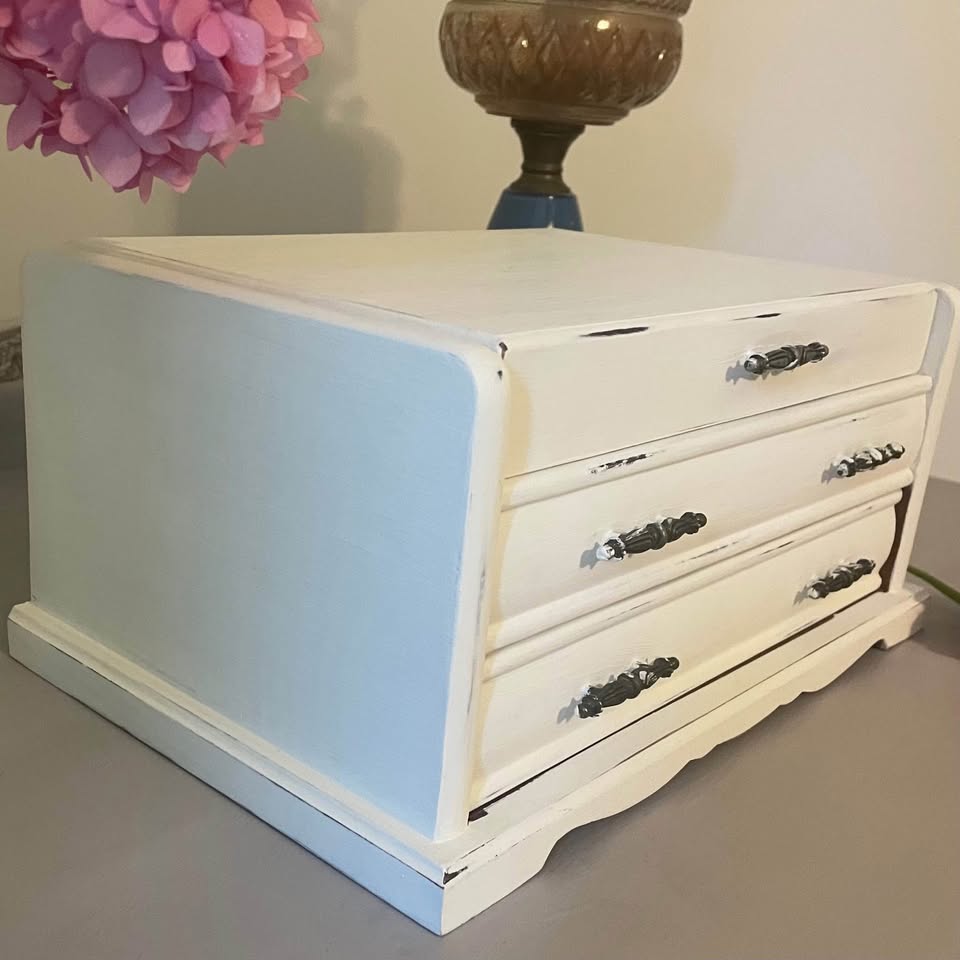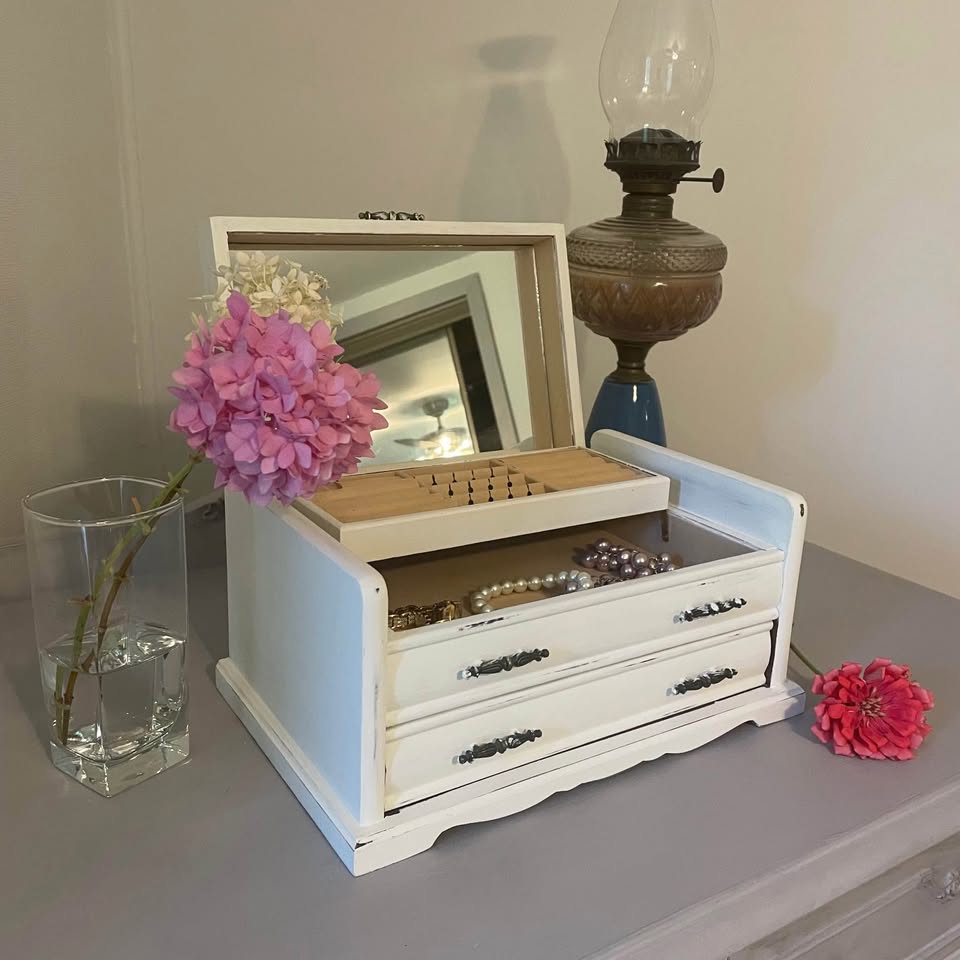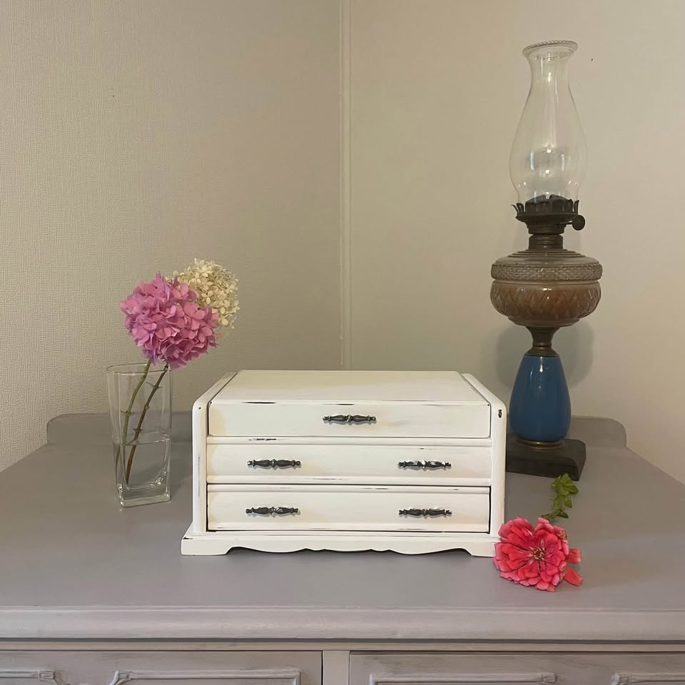 Vintage wooden jewelry box, lovingly refreshed with a soft white chalk paint for a timeless shabby chic look.