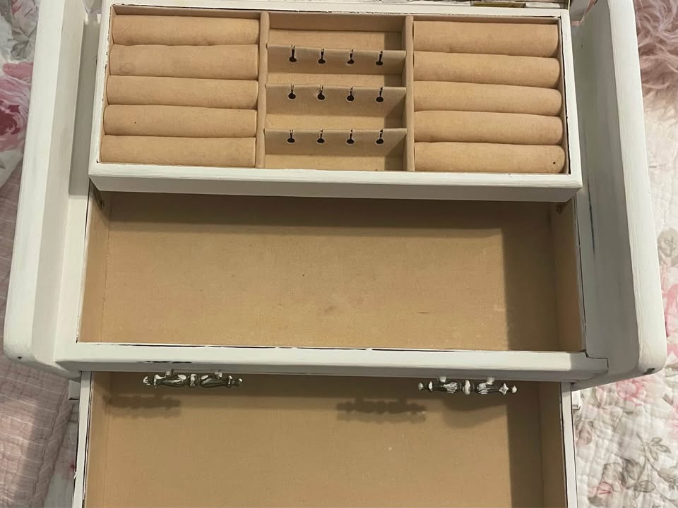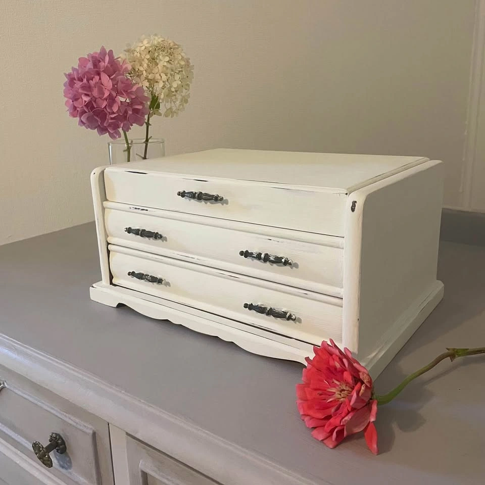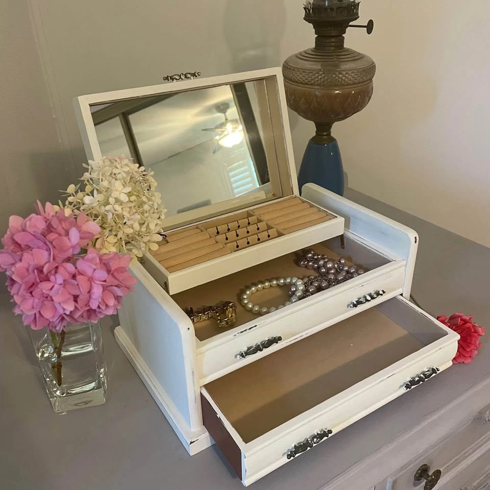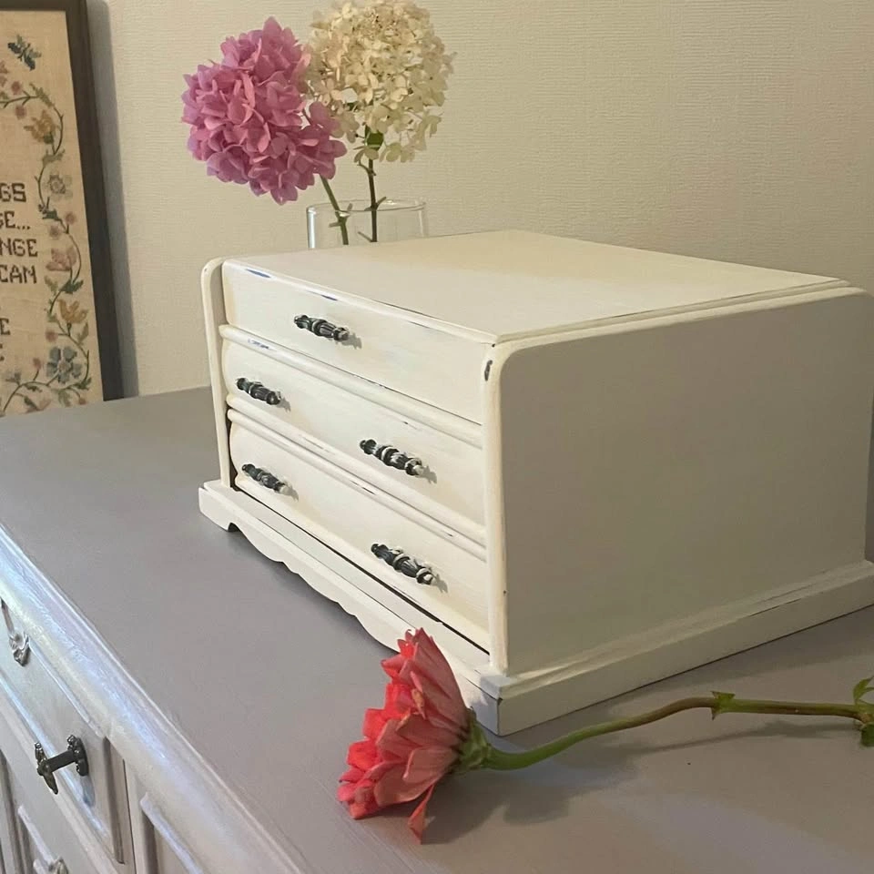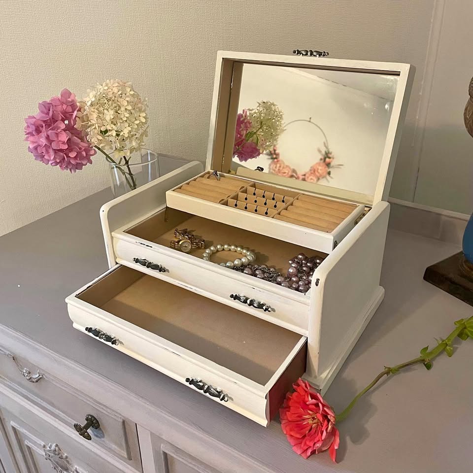 Vintage wooden jewelry box, lovingly refreshed with a soft white chalk paint for a timeless shabby chic look.