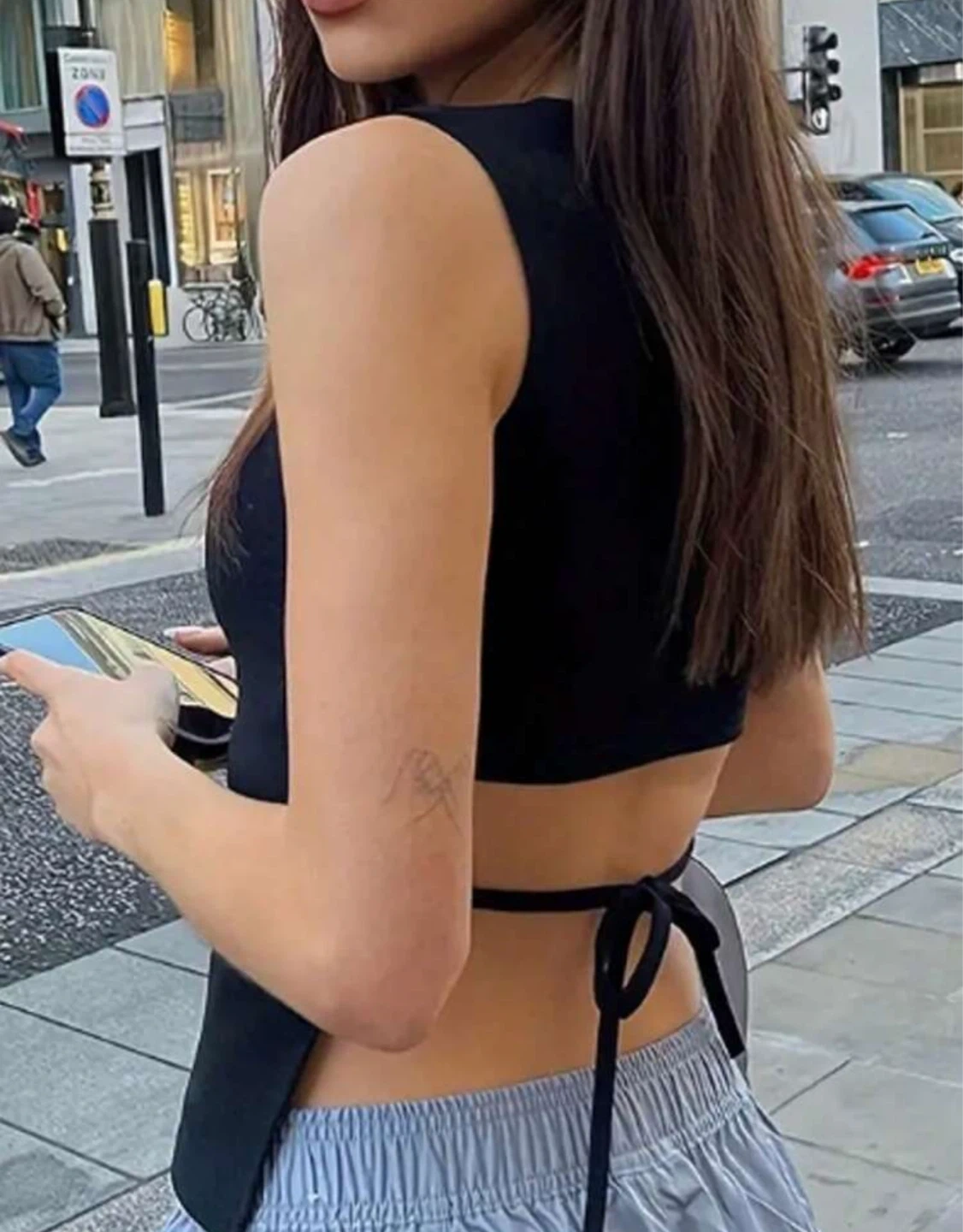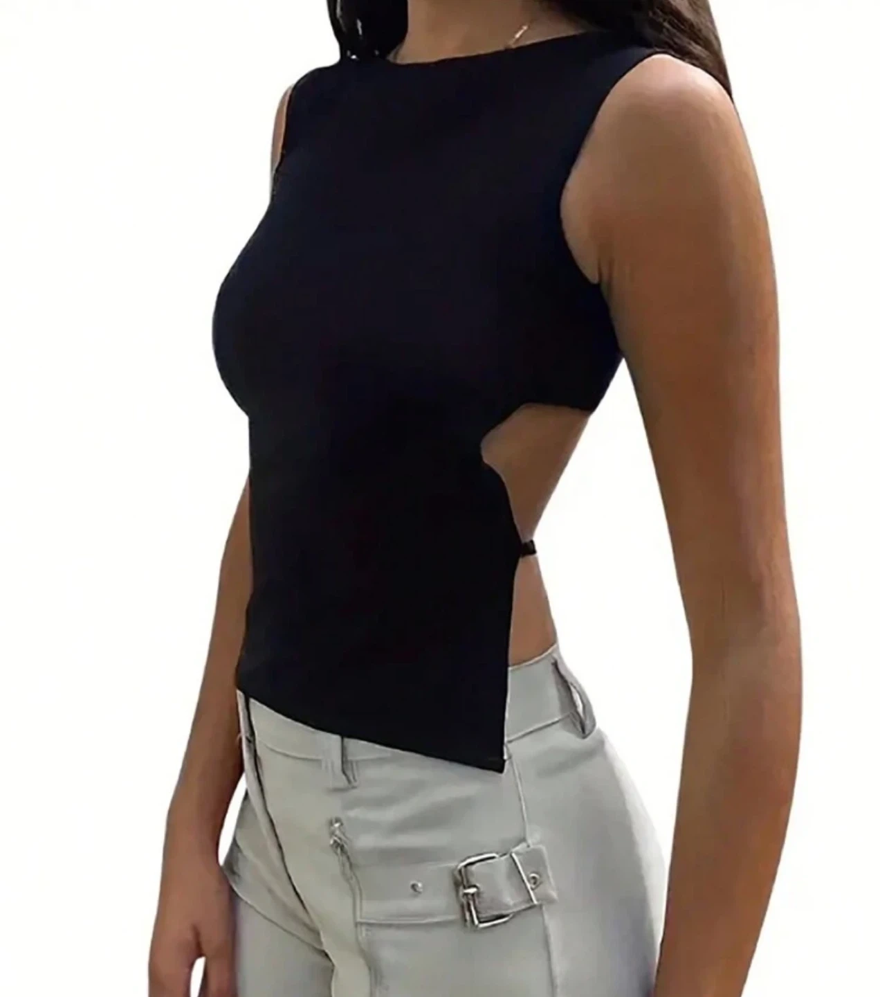 - a stylish black sleeveless top with a unique cutout design!