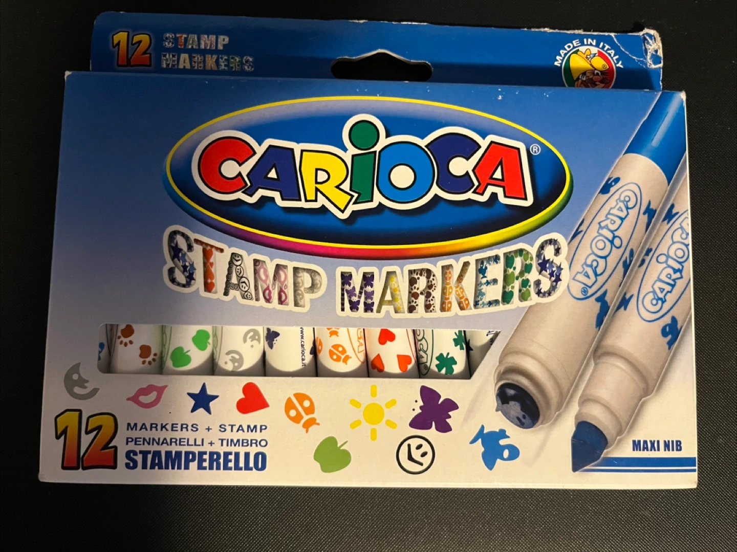 New set of 12 Carioca Stamp Markers - never used but the box has a few small tears Each marker has a different stamp design, perfect for adding fun details to your art projects. These markers are non-toxic and safe for kids aged 3 and up. Non-smoking & No pet household
