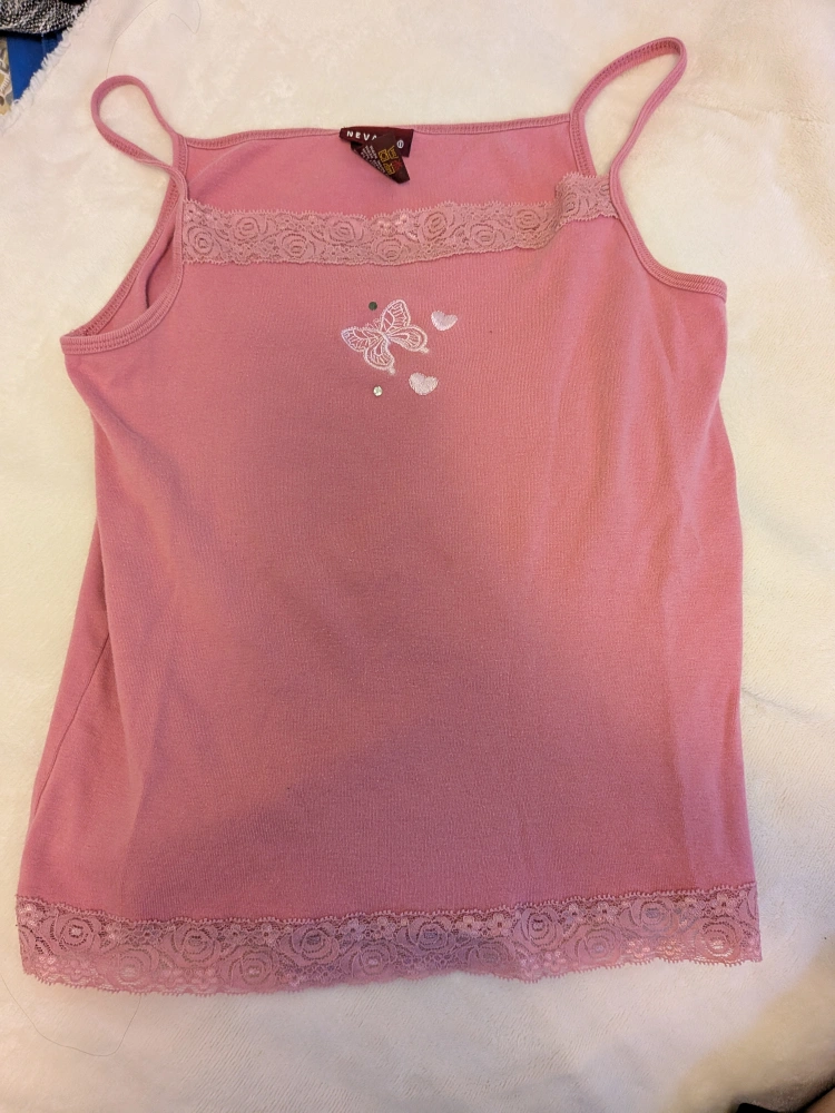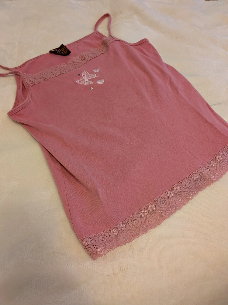 cute pink lacy tank top. It's a size small and features lace trim and a butterfly design. Perfect for layering or wearing on its own!