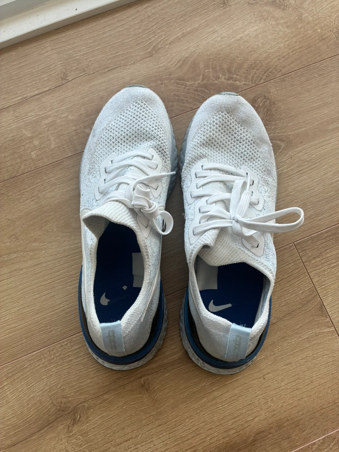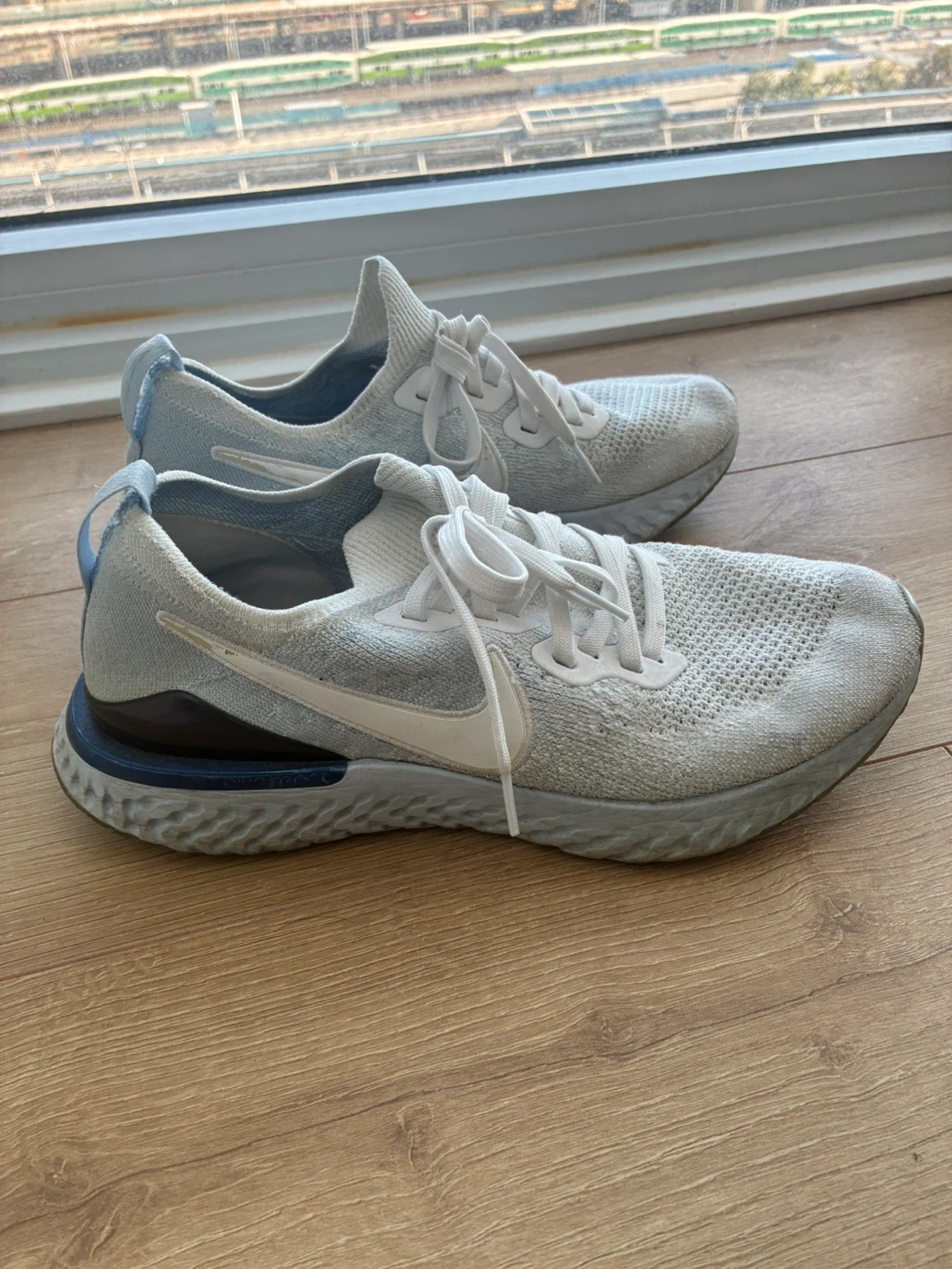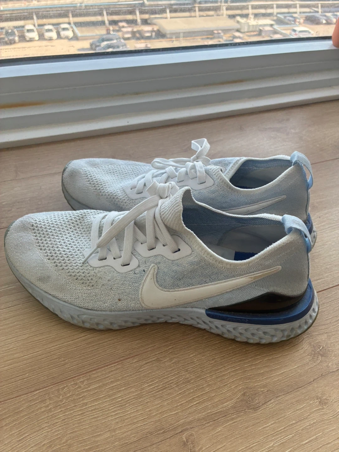 104Selling a pair of Nike Epic React Flyknit running shoes in white. They're in good condition and ready for a new owner. These shoes are known for their lightweight and comfortable feel, making them great for running or everyday wear!