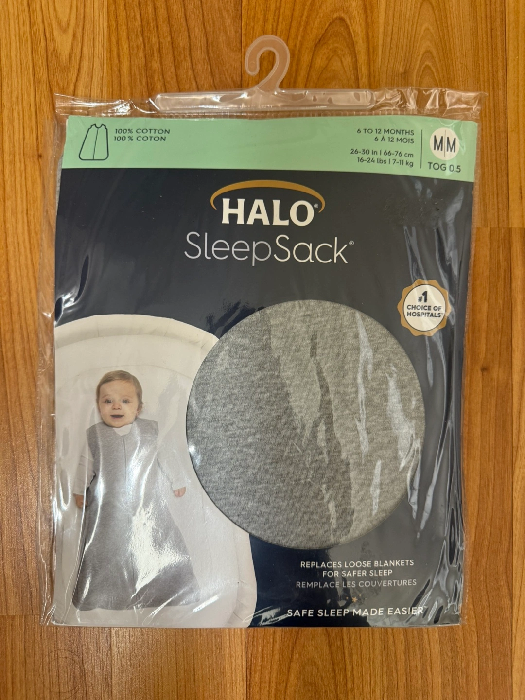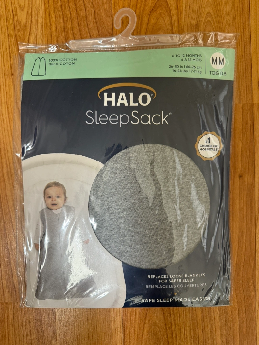 Selling a brand new Halo SleepSack in size 6-12 months! It's grey and made of 100% cotton. This sleep sack replaces loose blankets for safer sleep, making it a safe and cozy option for your little one