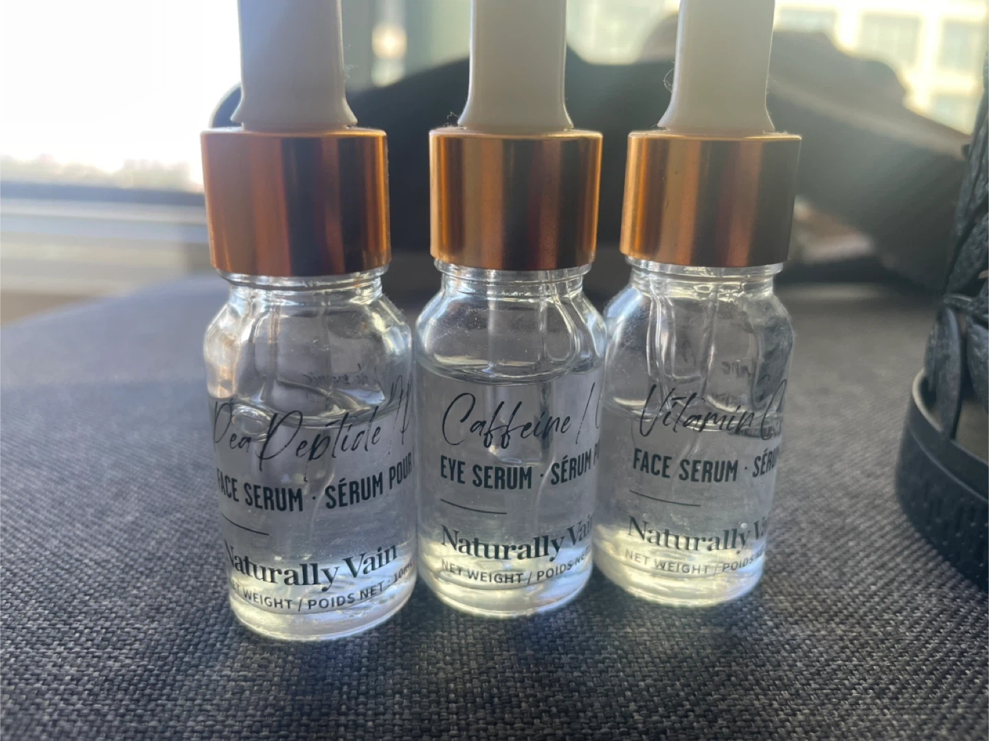 Selling three Naturally Vain serums: -Deo Peptide Face Serum -Caffeine Eye Serum -Vitamin C Face Serum Each bottle contains 10ml of serum