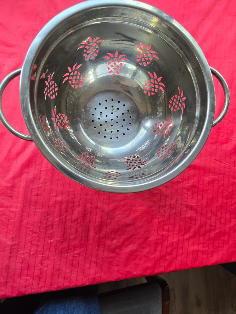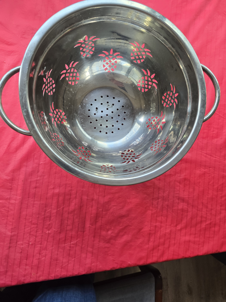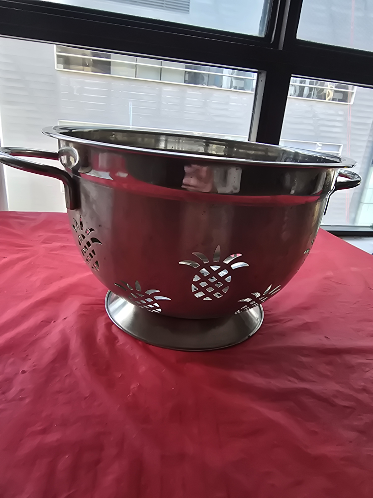 I'm selling a stainless steel colander! It has cute pineapple cutouts around the sides. Perfect for rinsing fruits and veggies or draining pasta. It's in great condition and ready for a new home