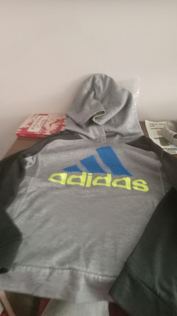 Selling a gently used Adidas hoodie in size XL. It's grey with a blue and neon yellow Adidas logo. Perfect for staying cozy on cooler days!