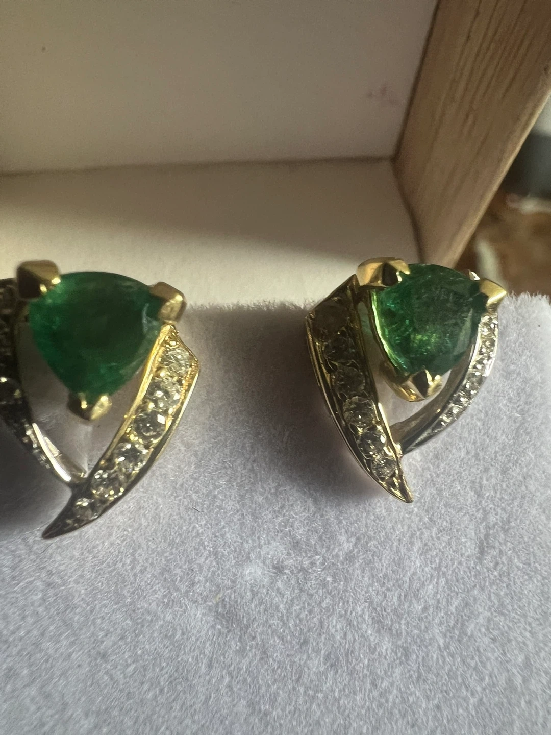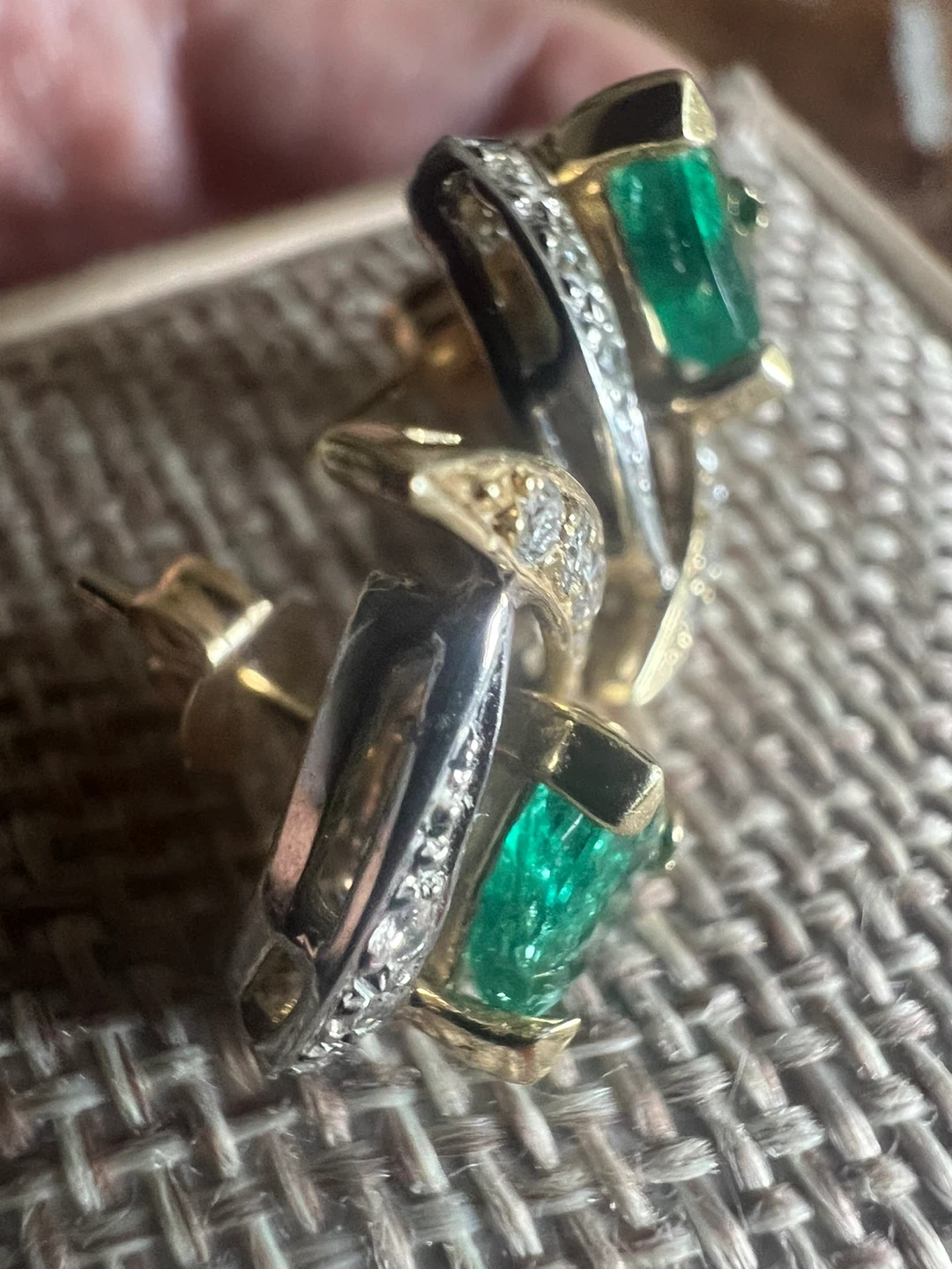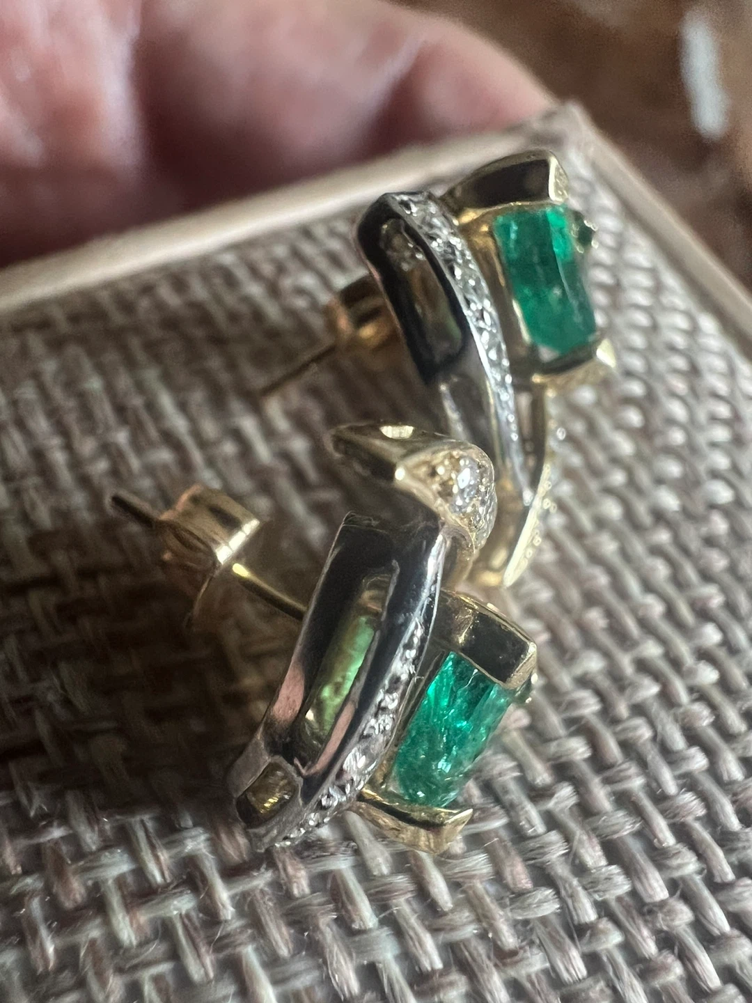 Beautiful 14 k yellow gold earrings featuring emeralds and diamonds. They have a unique design and are in great condition. Perfect for adding a touch of elegance to any outfit!