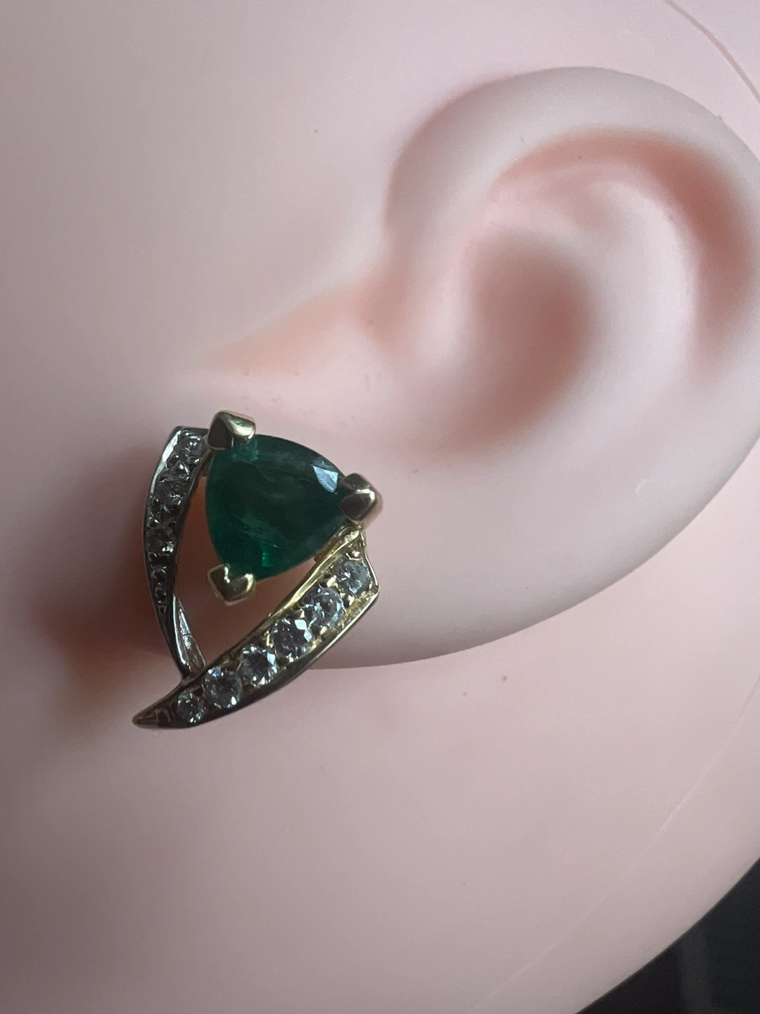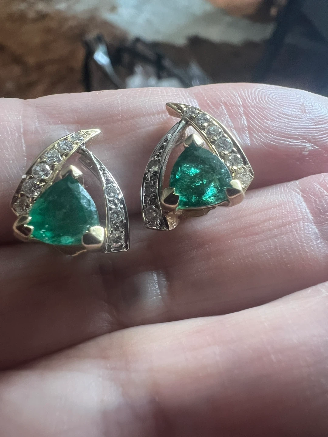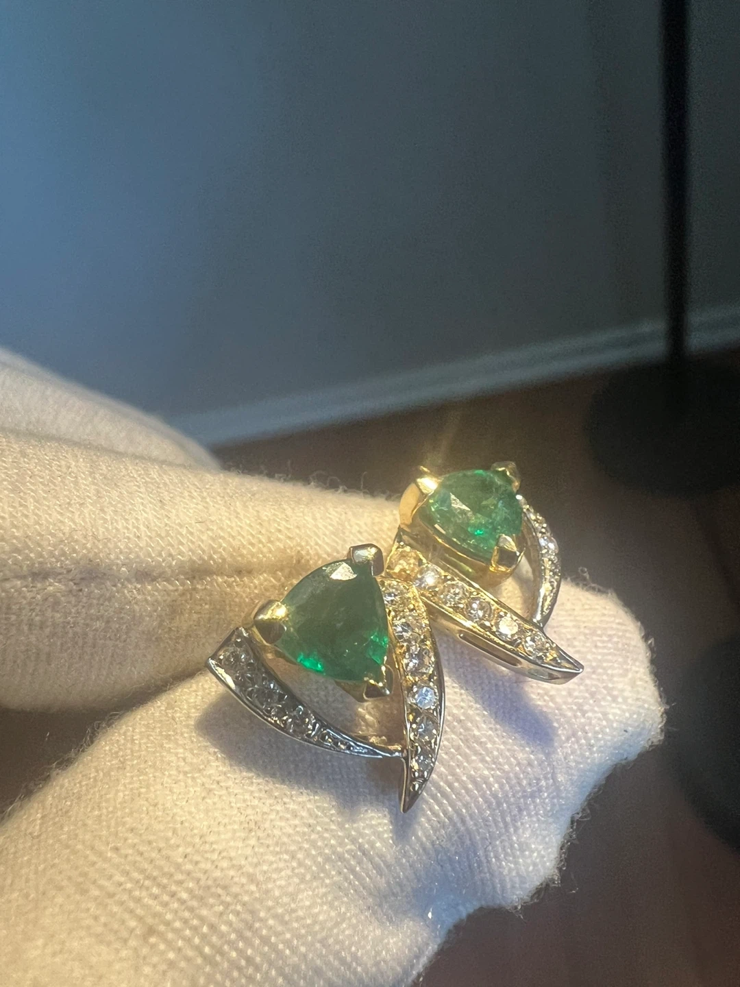 Beautiful 14 k yellow gold earrings featuring emeralds and diamonds. They have a unique design and are in great condition. Perfect for adding a touch of elegance to any outfit!